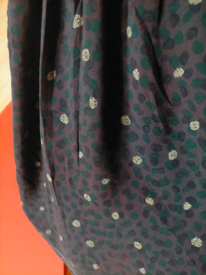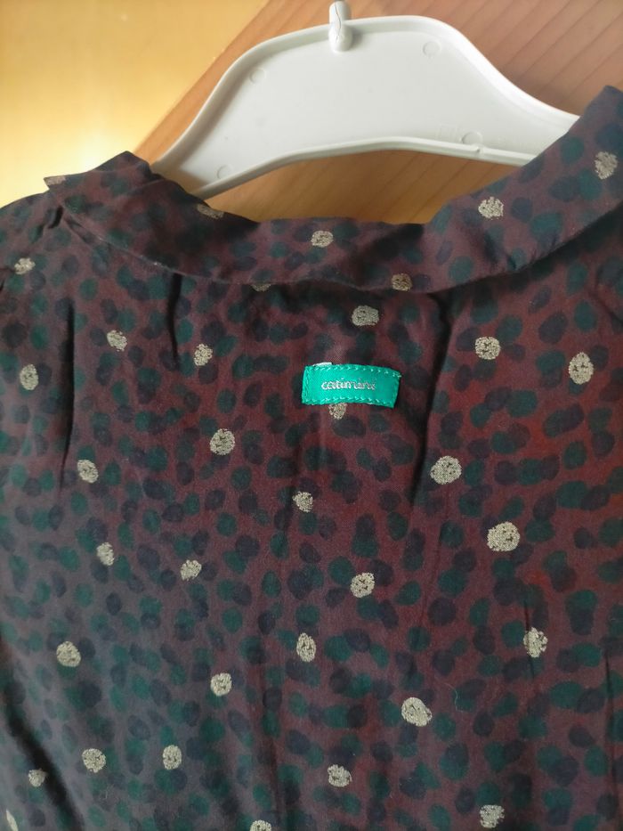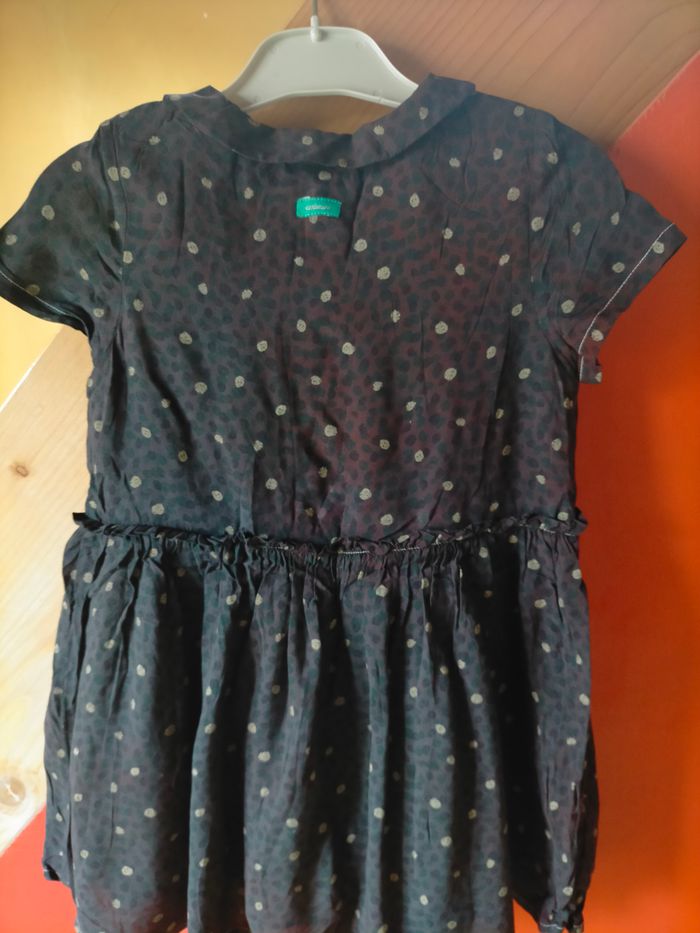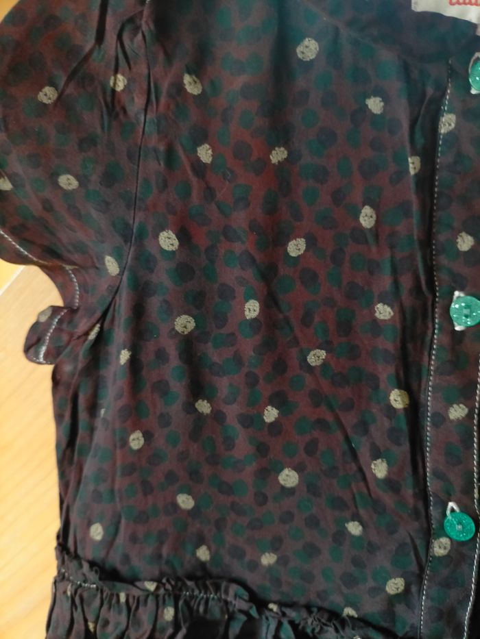BE Porté mais pas de défaut. Jolie robe à manches courtes en cotonnade fond nuancé de noir, vert foncé et bordeaux à pois brillants. Petit col et boutons verts devant, étiquette catimini verte au dos. Toute doublée