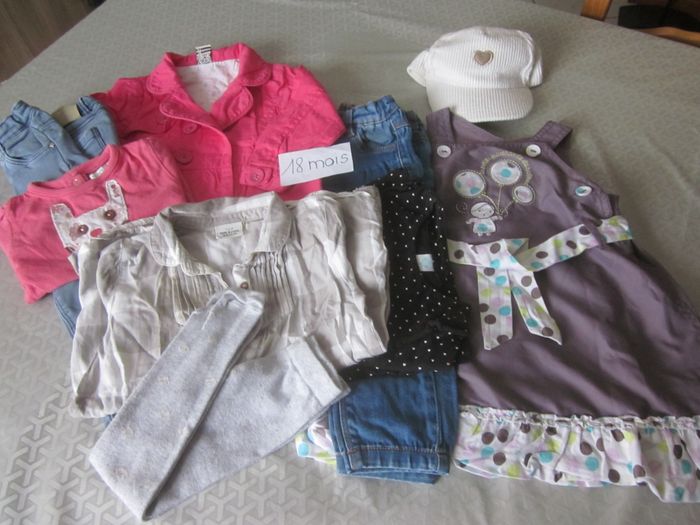 18m, robe sans manche + 2 jeans + 2 hauts ml + veste + casquette + liquette et collants offerts, tao, tex, in extenso