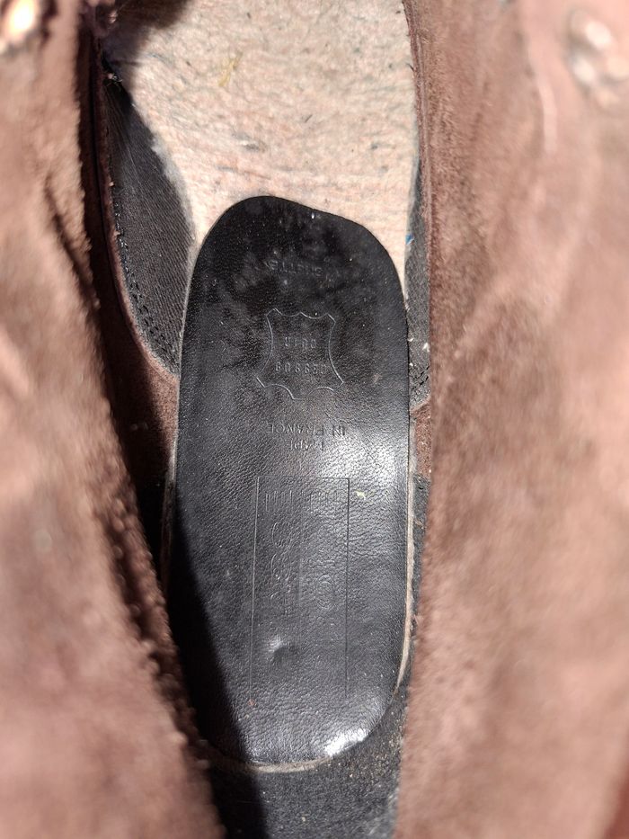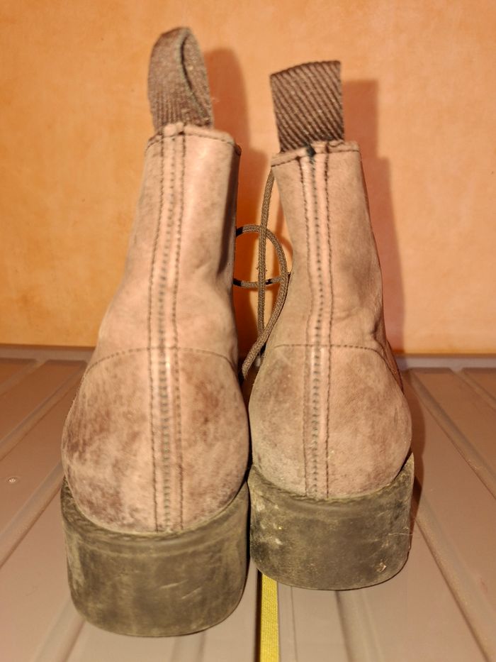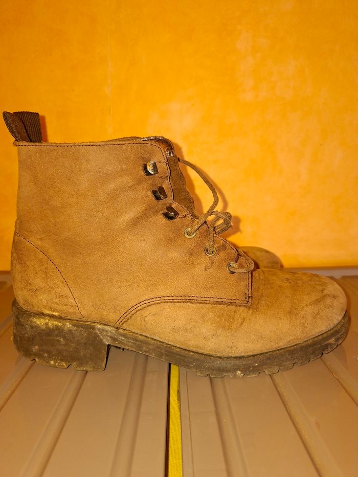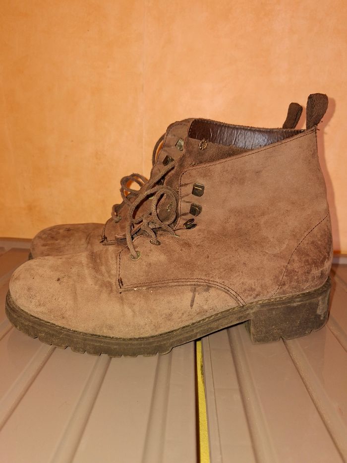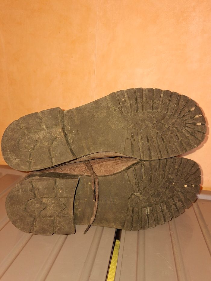 Vends une paire de bottines à lacets de style "combat boots" / chaussures de marche, robustes et de belle fabrication. ​Qualité : Véritable cuir (mention "Dessus Cuir" à l'intérieur) et Made in France. ​Confort & Solidité : Semelles extérieures en élastomère crantées pour une excellente adhérence. ​Pointure : 39. ​Style : Couleur marron terre, look vintage et authentique, idéal pour l'extérieur ou un style décontracté. ​État : Chaussures ayant déjà vécu avec des marques d'usage visibles sur le cuir et les semelles (voir photos). Elles restent parfaitement fonctionnelles et solides. Un petit nettoyage/brossage pourra leur redonner de l'éclat.