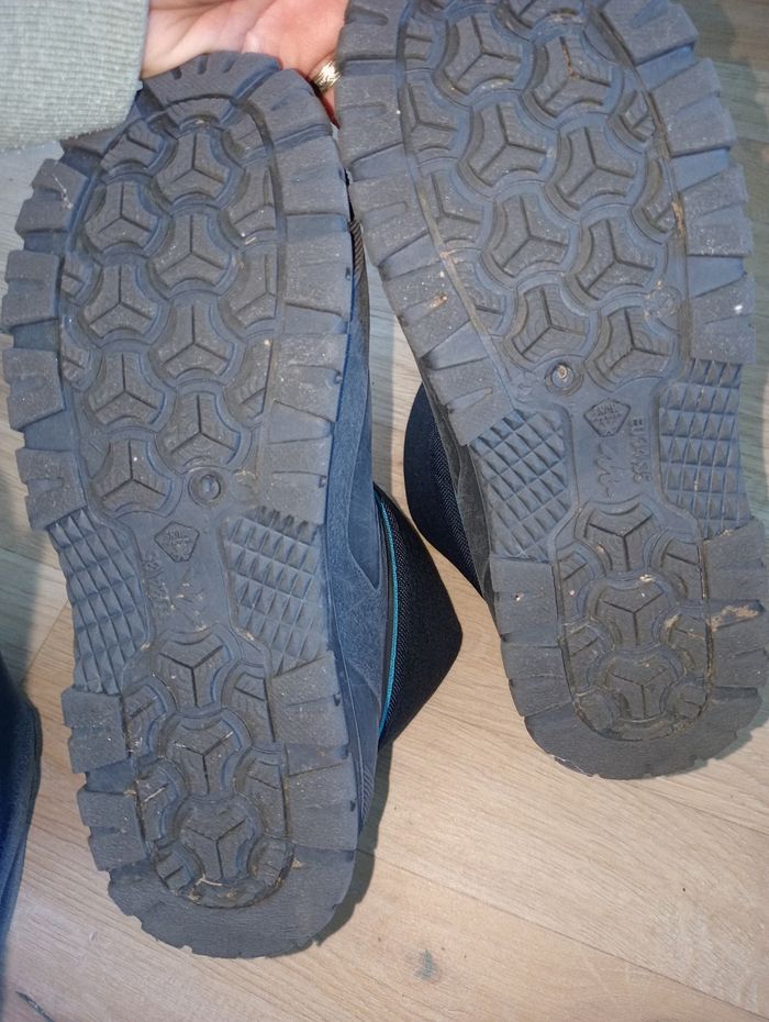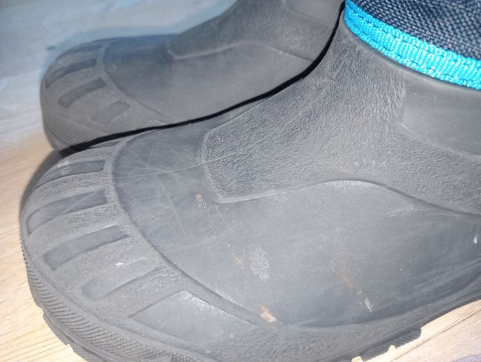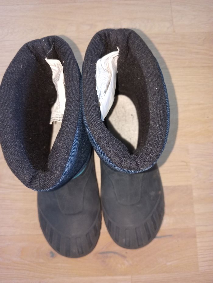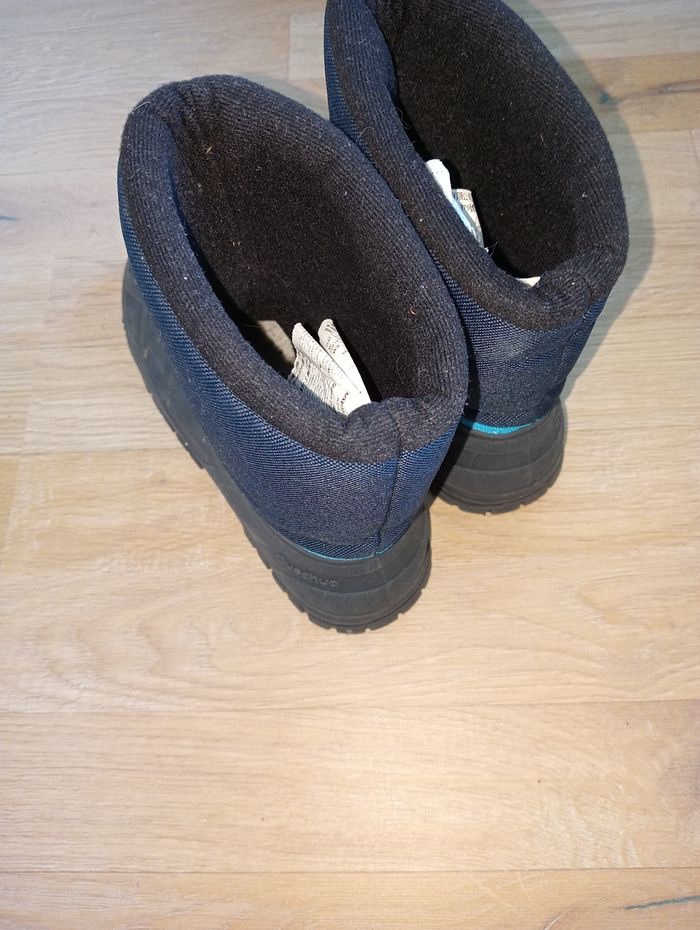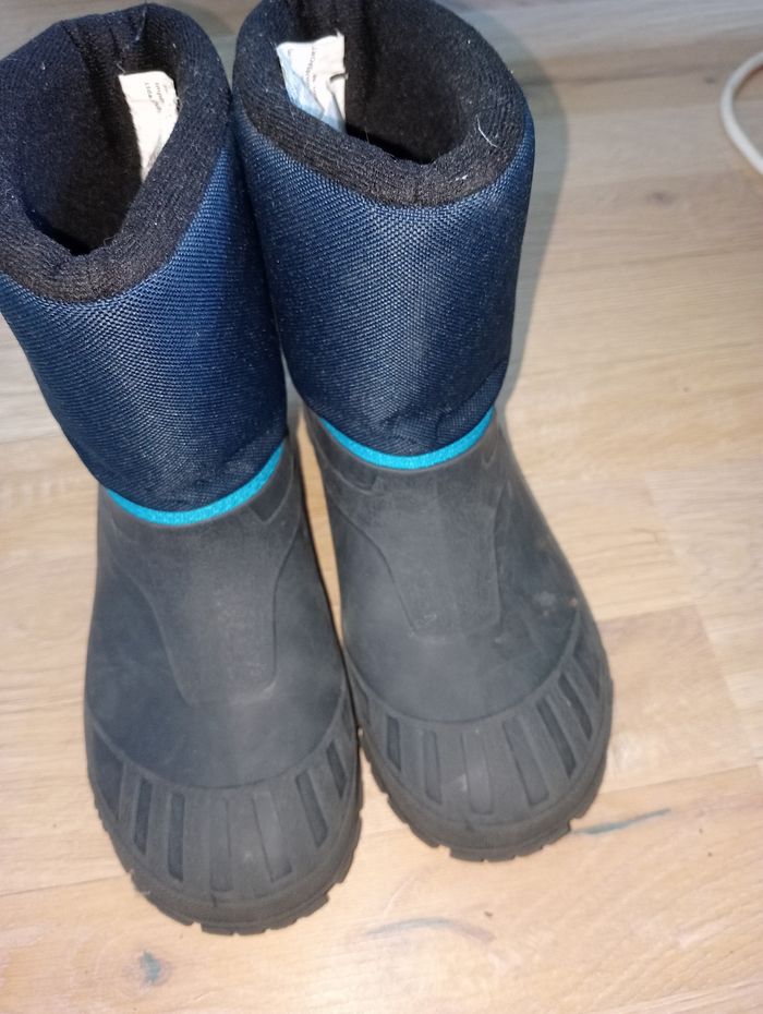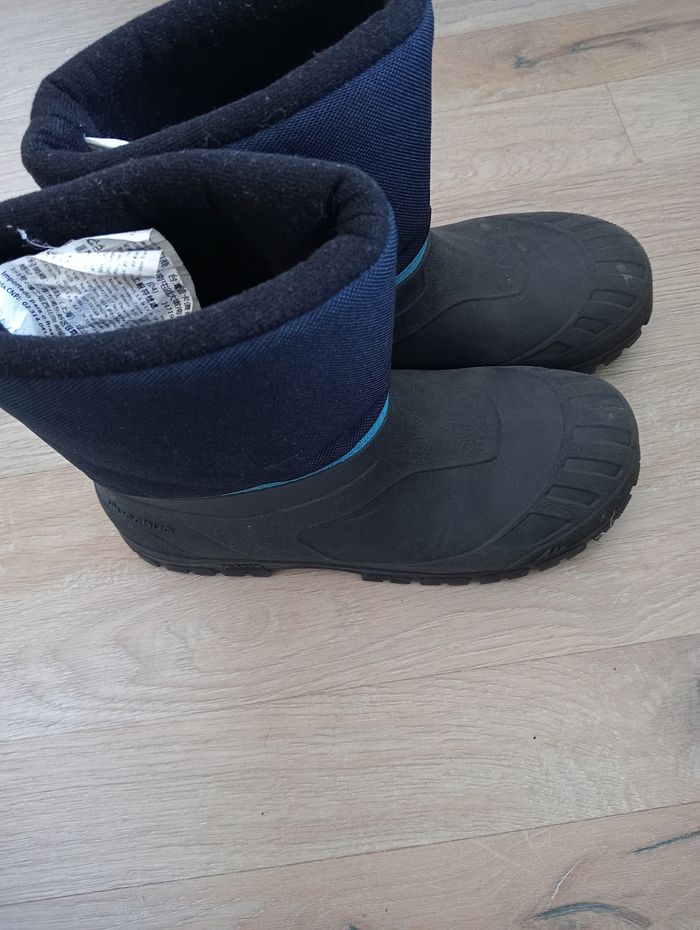 Après ski garçon 34-35 decathlon bon état (des petits frottements mais rien de méchant) en bas c'est du caoutchouc du coup si la neige est un peu fondue ça protège bien 👍