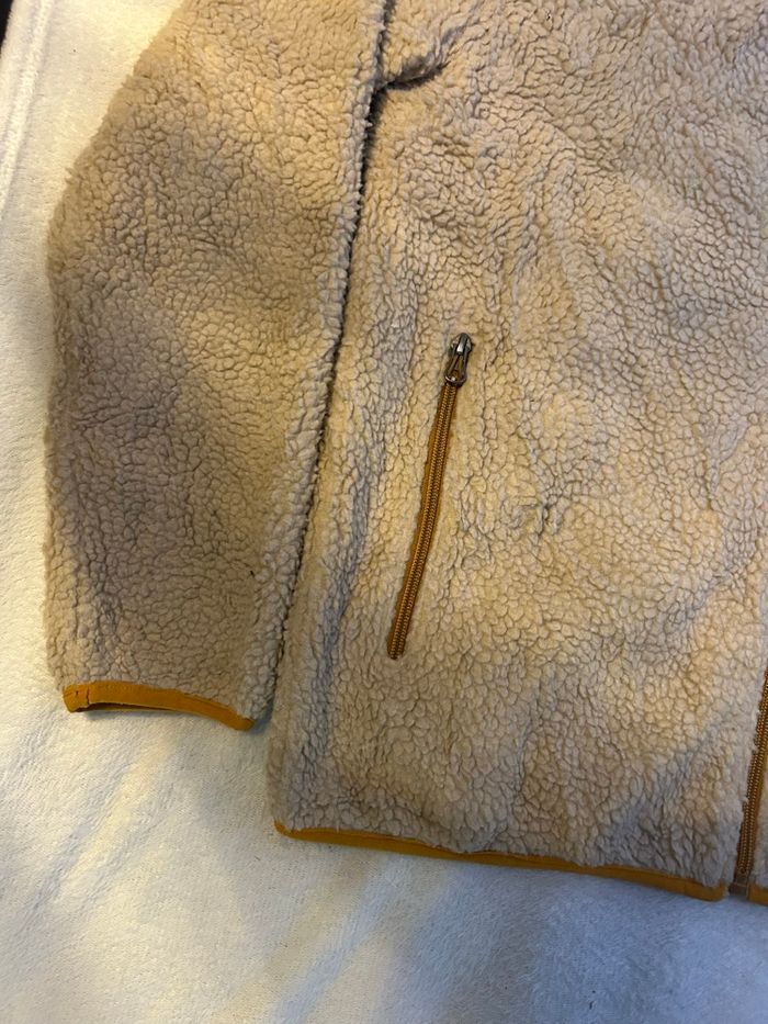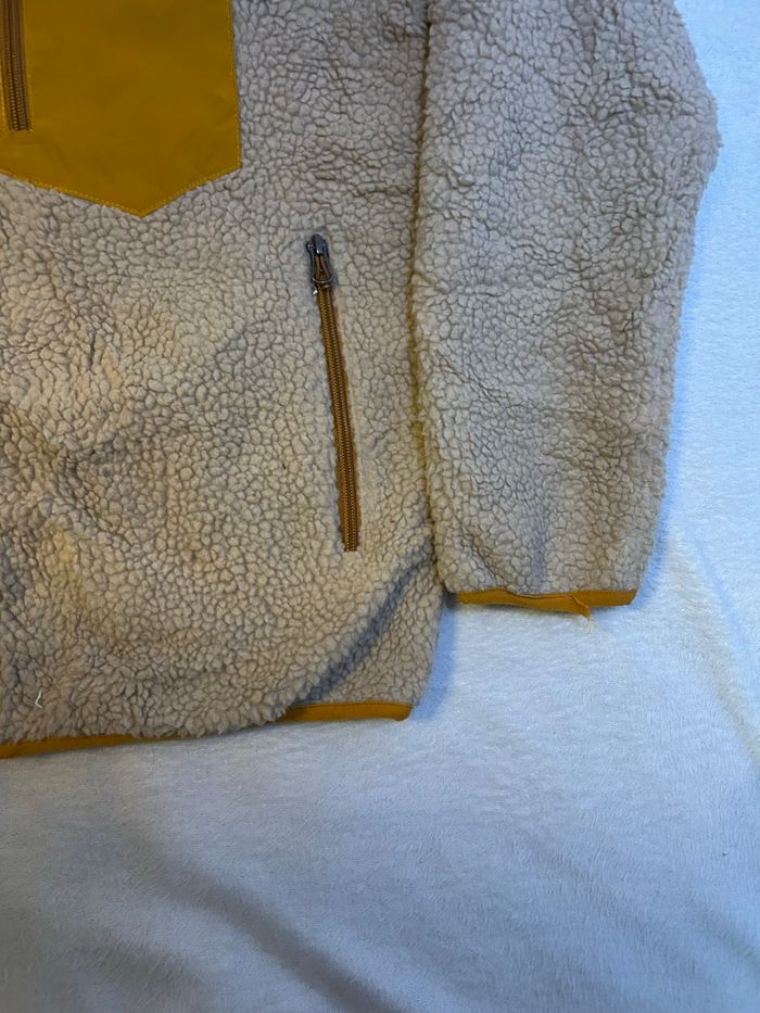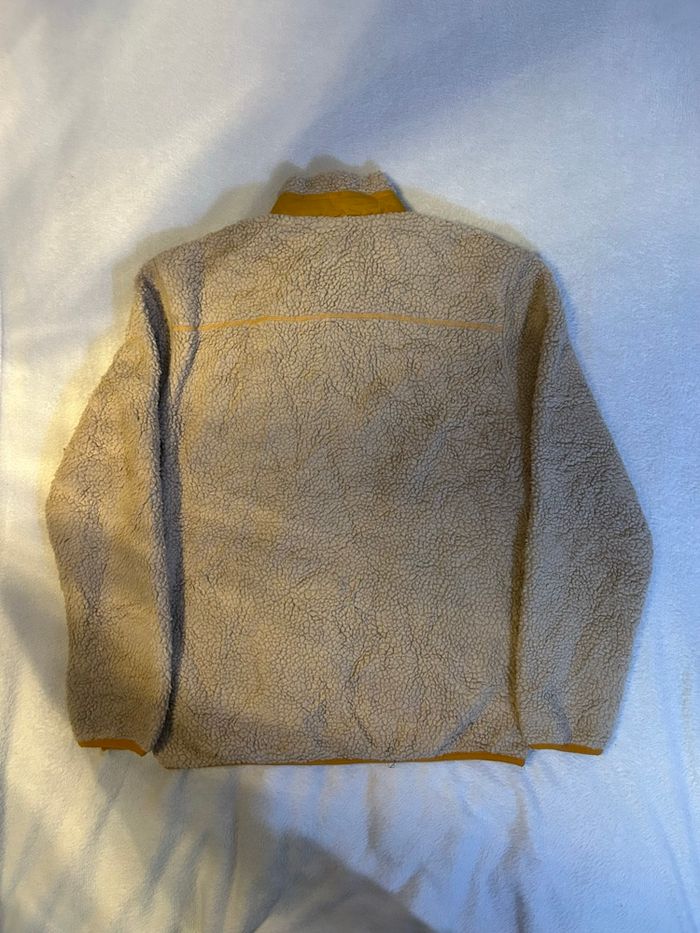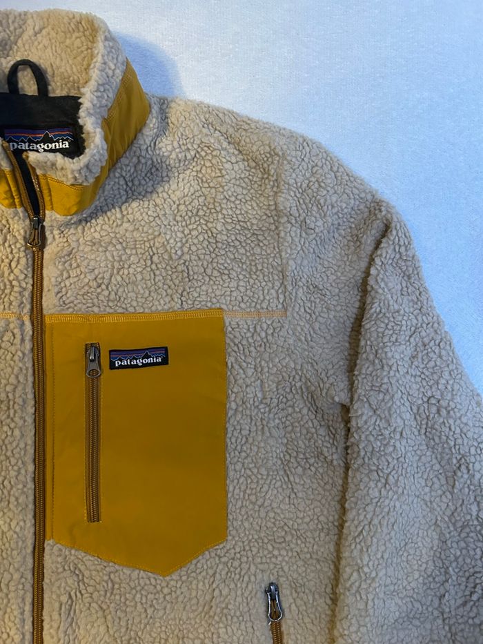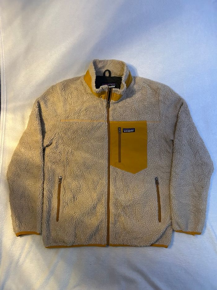 Je vends cette polaire Patagonia Retro-X vintage, en coloris écru avec empiècements contrastants jaune moutarde. Matière sherpa à l’extérieur, reconnue pour son confort thermique et sa résistance dans le temps. Coupe droite polyvalente, facile à porter au quotidien comme en extérieur. Modèle zippé avec poches fonctionnelles et poche poitrine iconique Patagonia, très apprécié pour son style vintage et sa qualité premium.