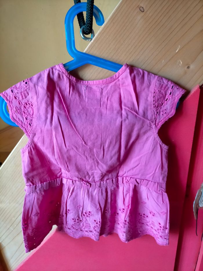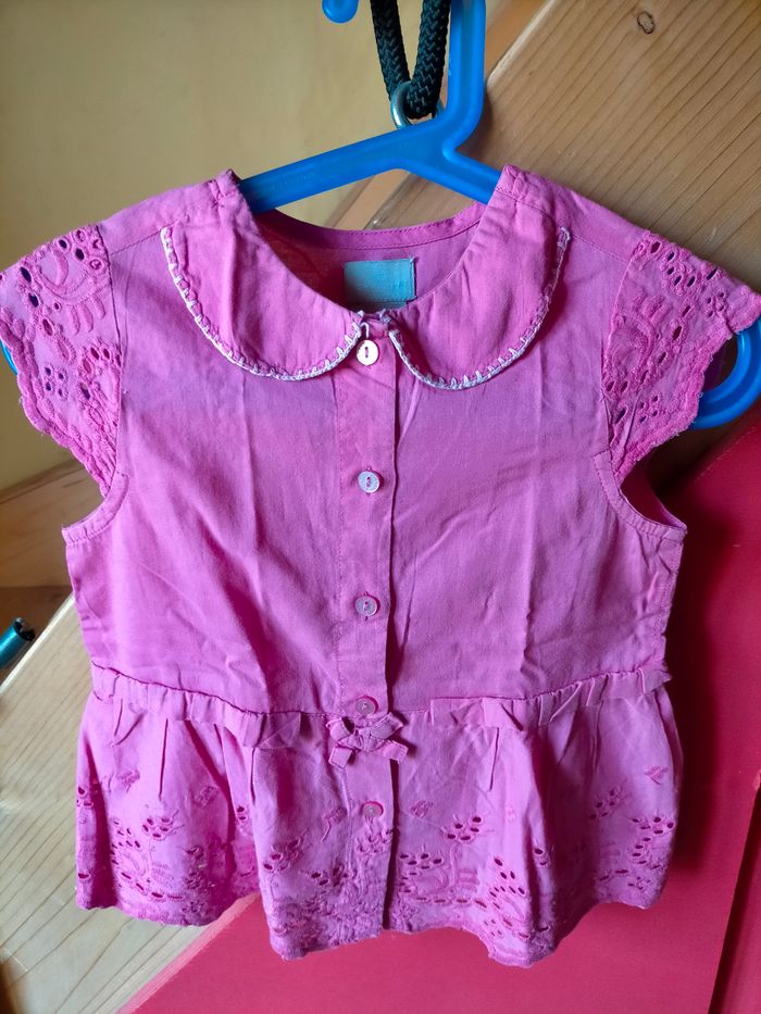 BE Porté mais pas de défaut. Jolie blouse à petites manches et petit col rond en cotonnade rose. Manches et base en broderie anglaise lien à nouer à la taille et boutons devant