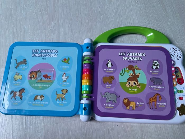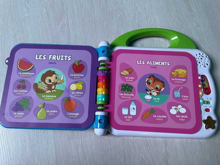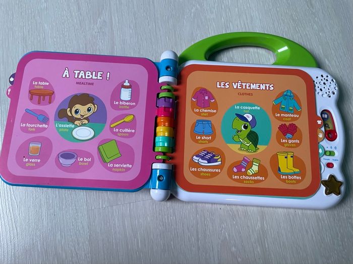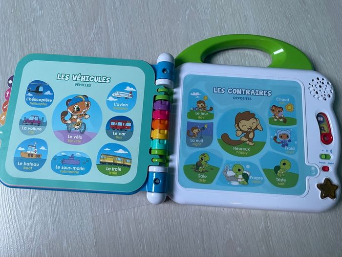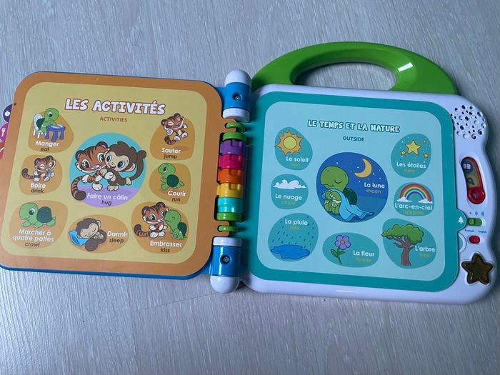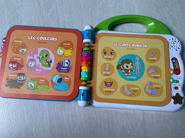 Cet imagier bilingue comporte 12 pages éducatives plastifiées et illustrées avec capteurs sensitifs pour toucher les illustrations et faire de nombreuses découvertes. En touchant le livre, l'enfant déclenche des mots / phrase / sons en français et anglais. Chaque page d’apprentissage est classée par thème : les animaux domestiques / sauvages, les aliments, les couleurs, les parties du corps, les vêtements, les contraires… 3 modes de jeu : Vocabulaire, Découvertes et Sons amusants. 2 chansons en français ou en anglais et des sons amusants. La poignée adaptée aux petits permet une prise en main facile. Réglage du volume sonore Arrêt automatique afin de préserver la durée de vie des piles