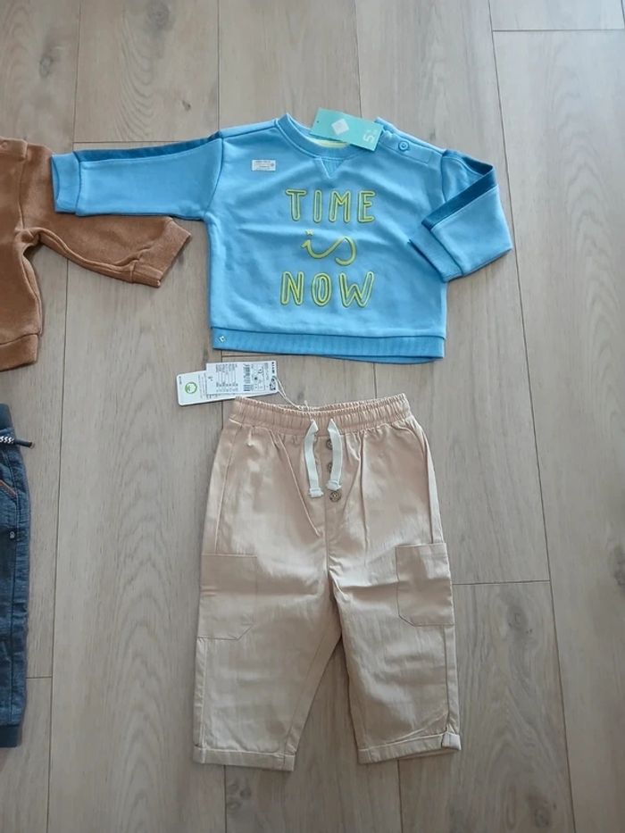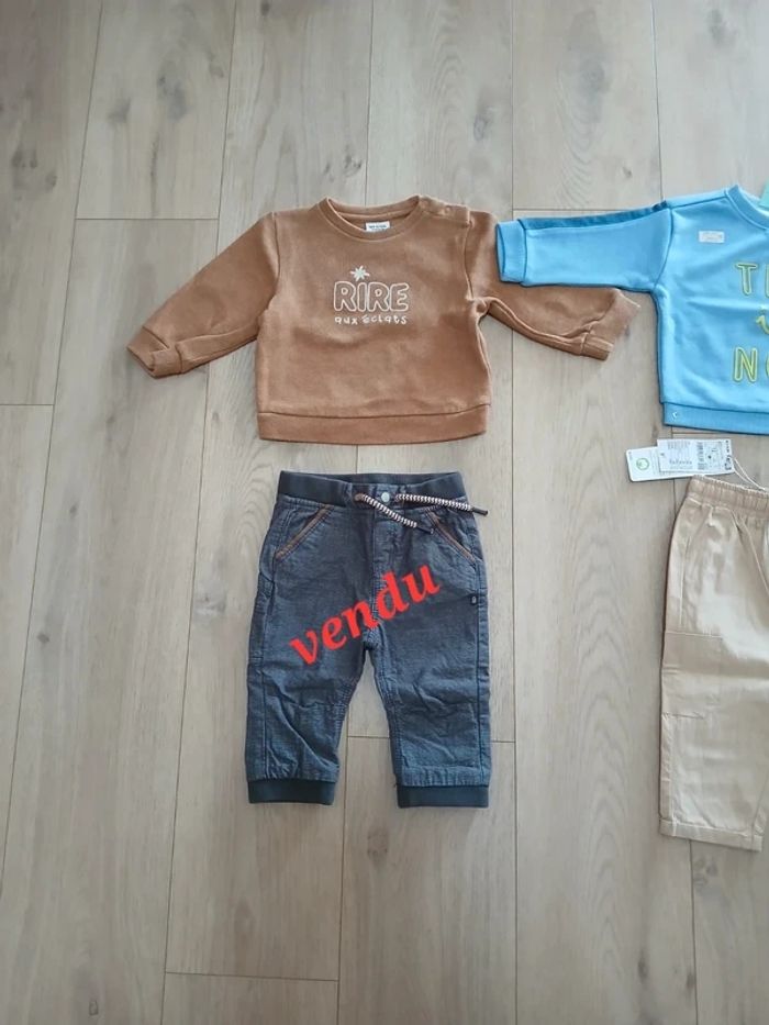 Lot 12 mois comprenant : - 1 sweat neuf avec étiquette de marque Tex - 1 sweat en parfait état de marque Tape à l'Oeil - 1 pantalon léger neuf avec étiquette de marque Kiabi 6€ le tout