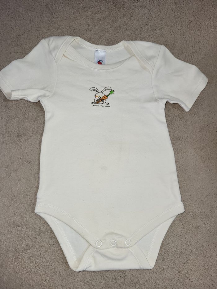 Bodys manches courtes mixte 12 mois Baby club Crème motifs lapin et carotte Quelques tâches #virgy61garcon12mois #virgy61fille12mois