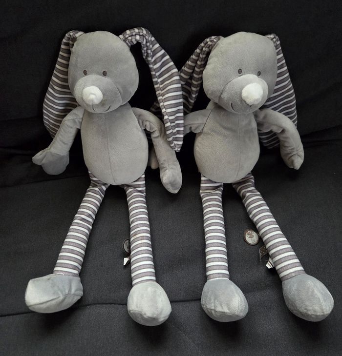 Lot de 2 peluches Lapin Vaco. 1 Peluche Lapin en velours de couleur gris. Jambes et oreilles en velours de couleur blanc et gris rayé. Étiquettes rubans sur une des jambes. 1 Peluche Lapin musical en velours de couleur gris. Peluches qui mesurent 43 cm env