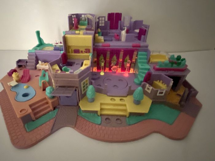 Polly Pocket Le magnifique manoir de Polly de 1994. Jeu représentant une maison de maître avec écurie, piscine, terrasse, véranda etc... Les lumières fonctionnent en appuyant sur le bouton jaune (table du patio) près de la piscine (voir photos 3 et 4) et tournez le buisson près de la porte d'entrée pour changer les couleurs et transformer le hall en piste de danse, (pile fournie). La porte du garage s'ouvre en appuyant sur le bosquet vert situé à côté. Vendu sans personnages, manque les drapeaux et accessoires. En très bon état, pas de casse ni décoloration.