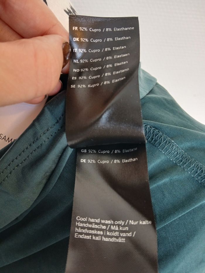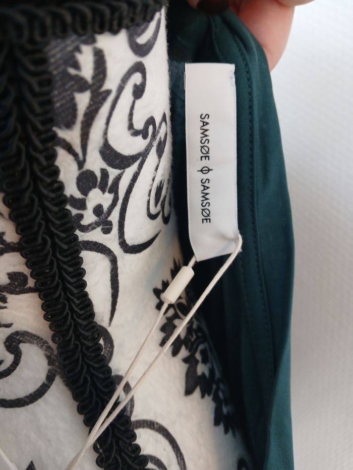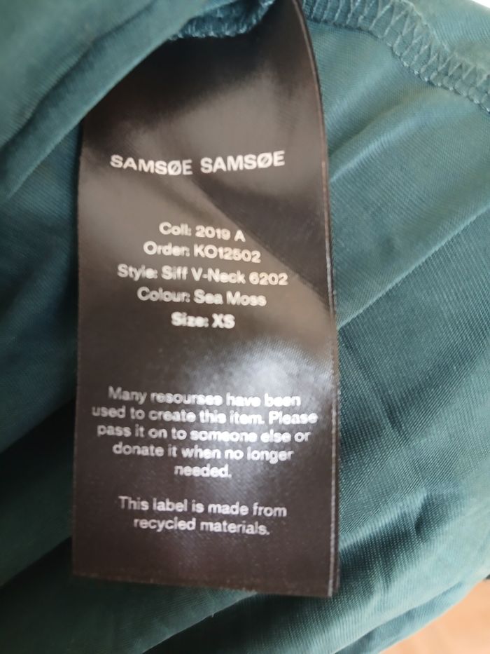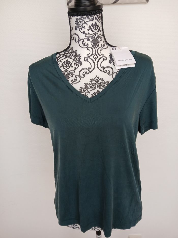 t-shirt col en V de la marque Samsøe & Samsøe, modèle "Siff", coloris "Sea Moss" (très beau vert émeraude/mousse). ​Matière haut de gamme : 92% Cupro (aspect et toucher soie, très fluide) et 8% élasthanne pour le confort. ​État : Neuf avec étiquette. ​Prix d'origine : 79 € ​Conseil entretien : Lavage à la main à froid.