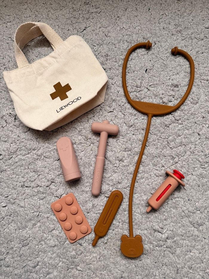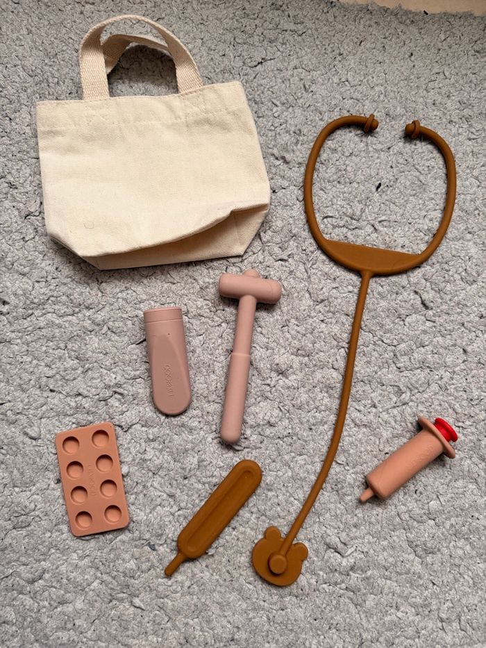 Joli set de docteur Liewood en silicone souple, idéal pour les jeux d’imitation dès le plus jeune âge. Contenu du set : • 1 sac de rangement en toile avec croix • 1 stéthoscope • 1 seringue • 1 marteau à réflexes • 1 thermomètre • 1 tube de crème • 1 plaquette de médicaments 🎨 Coloris terracotta et tons neutres – design scandinave 🌿 Silicone doux, sûr et agréable au toucher 🧠 Stimule l’imaginaire, la motricité fine et le jeu libre Très bon état général. Envoi rapide et protégé. D’autres photos sur demande. #liewood #jouetmedecin #jouetdocteur #silicone #montessori #jeudimitation #jouetbebe #cadeauenfant #jouetenfant