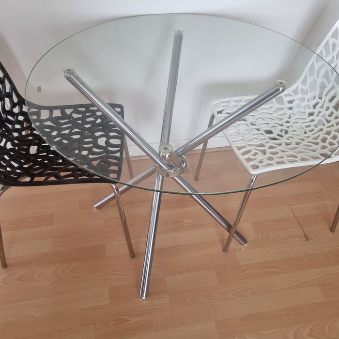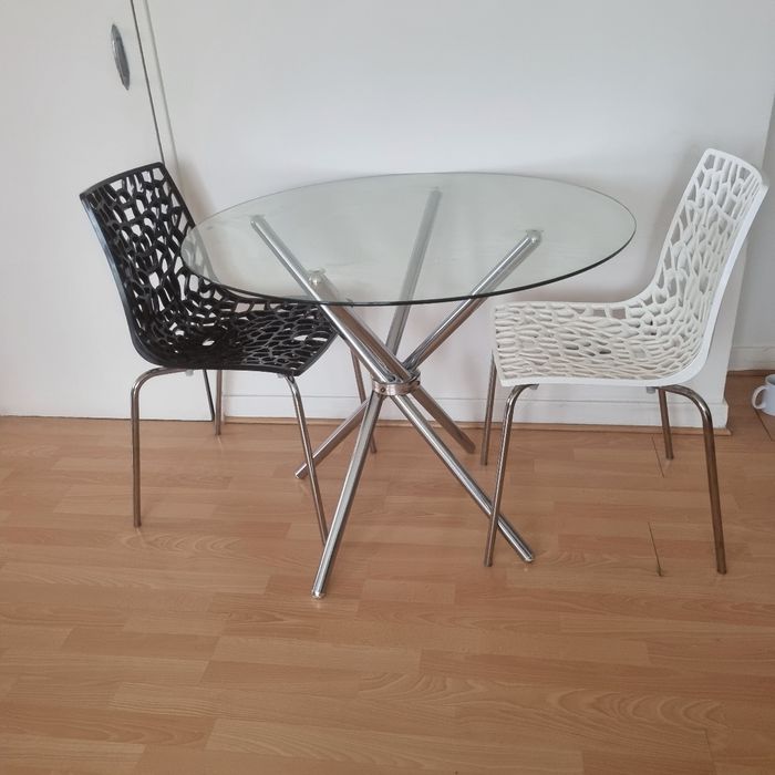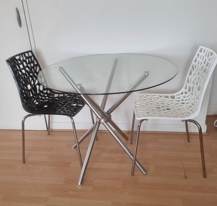 Table plateau en verre 90 cm de diamètre avec deux chaises à 150 € sachant que la chaise vaut 70 € actuellement chez conforma