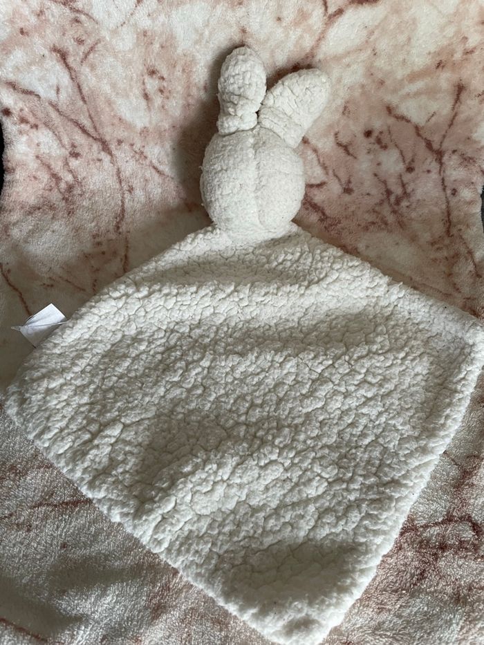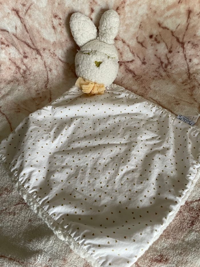 Doudou plat losange lapin blanc beige Petit motifs des cœur doré Collection: Petit Carrousel Mathilde M. Toudoux Occasion en très bon état Vous achetez le doudou que vous voyez sur la photo