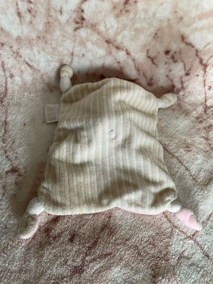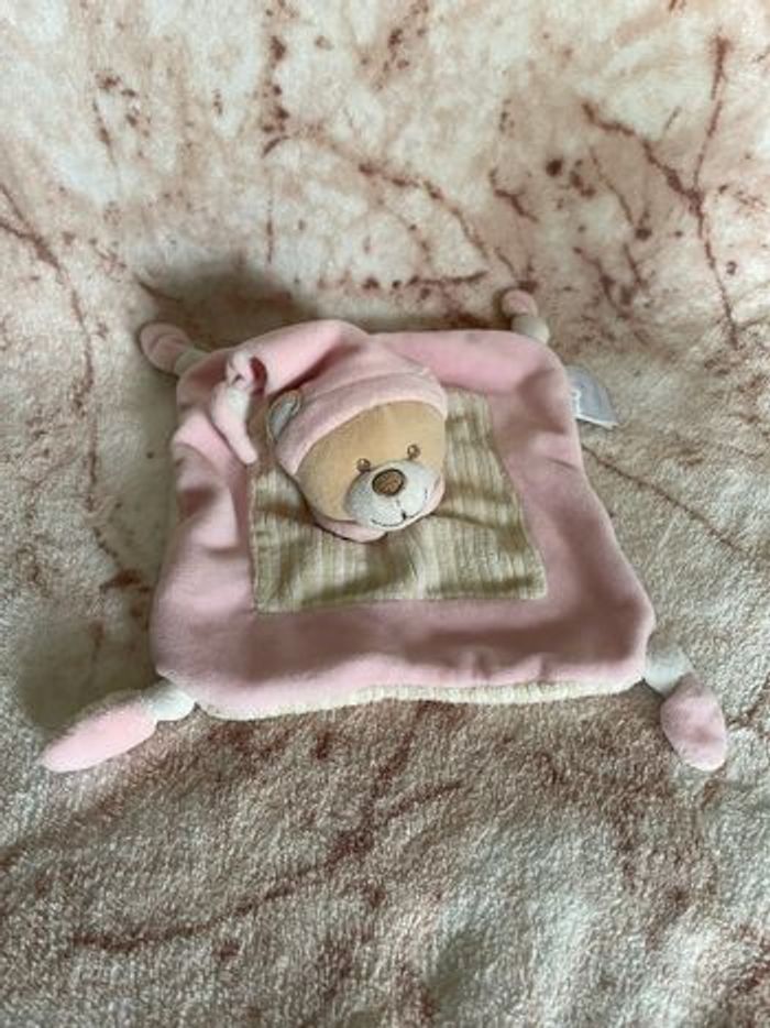 Doudou plat ours bonnet rose beige blanc 4 noeuds aux extrémités CMP Mes Petits Cailloux Occasion en très bon état Vous achetez le doudou que vous voyez sur la photo