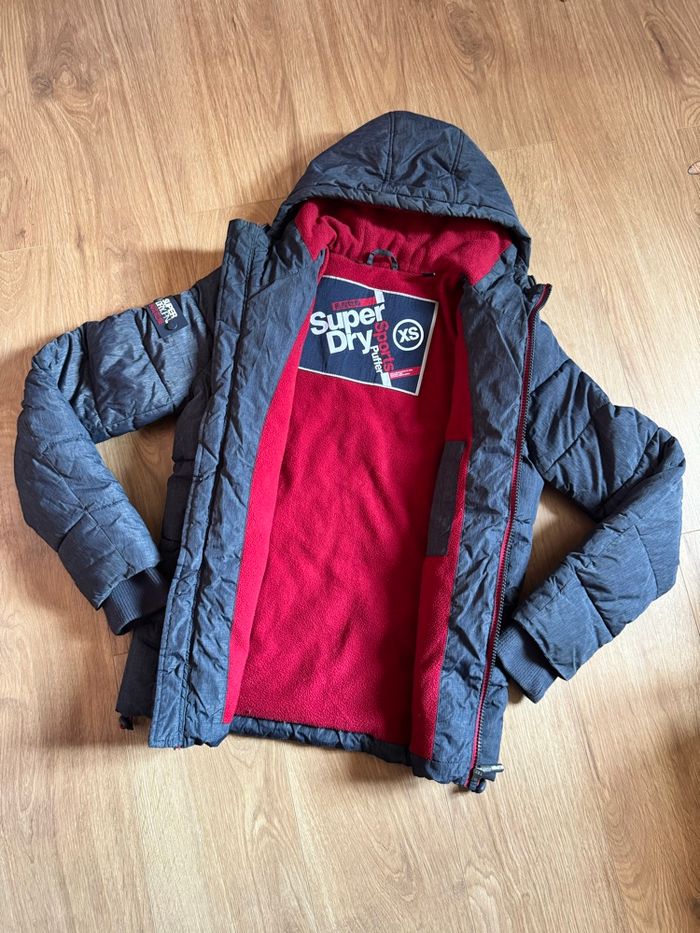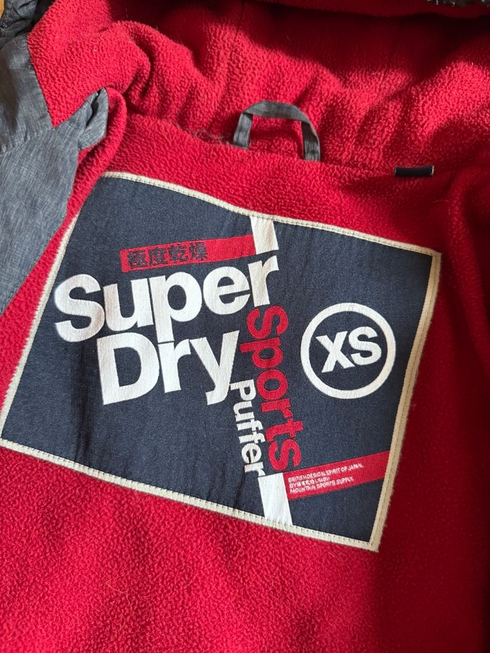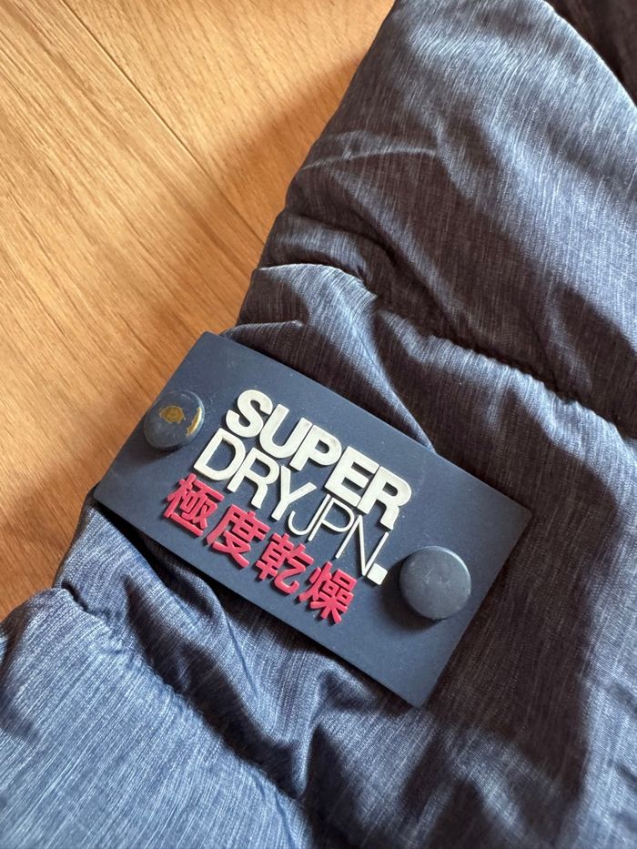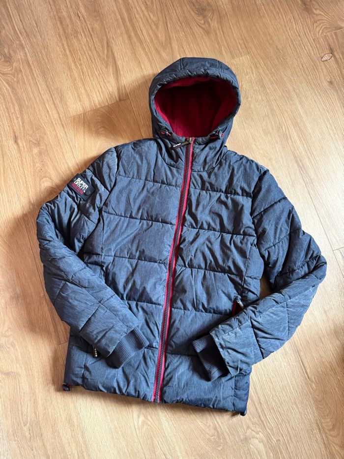 Doudoune à capuche Superdry bleu et rouge : • bon état général, défaut sur le logo de la manche (voir photo 4) • taille XS • 100% polyester 📦 envoi rapide et protégé