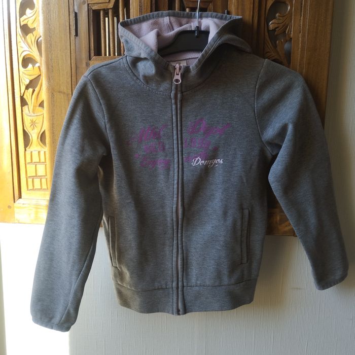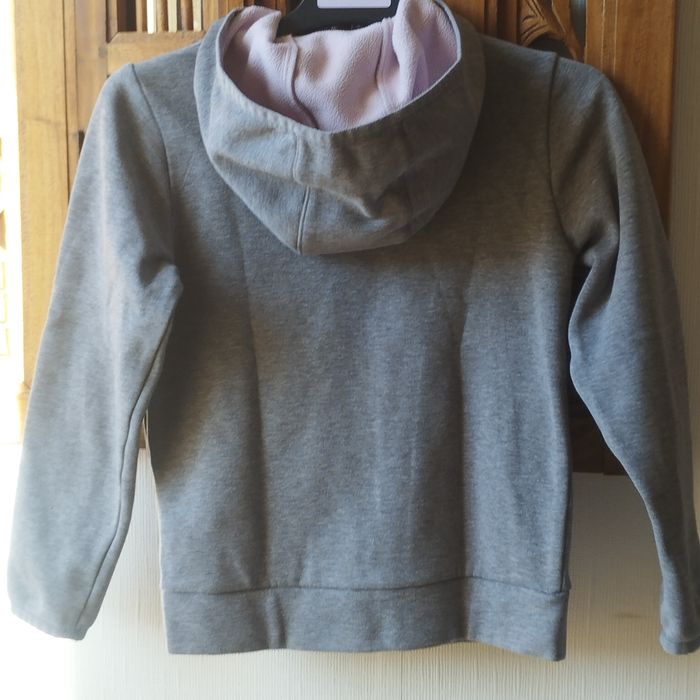 Veste sweat à capuche fille 8ans Domyos, intérieur polaire. Se ferme par fermeture éclair, 2 poches avant. Coloris Gris, intérieur polaire Lilas.