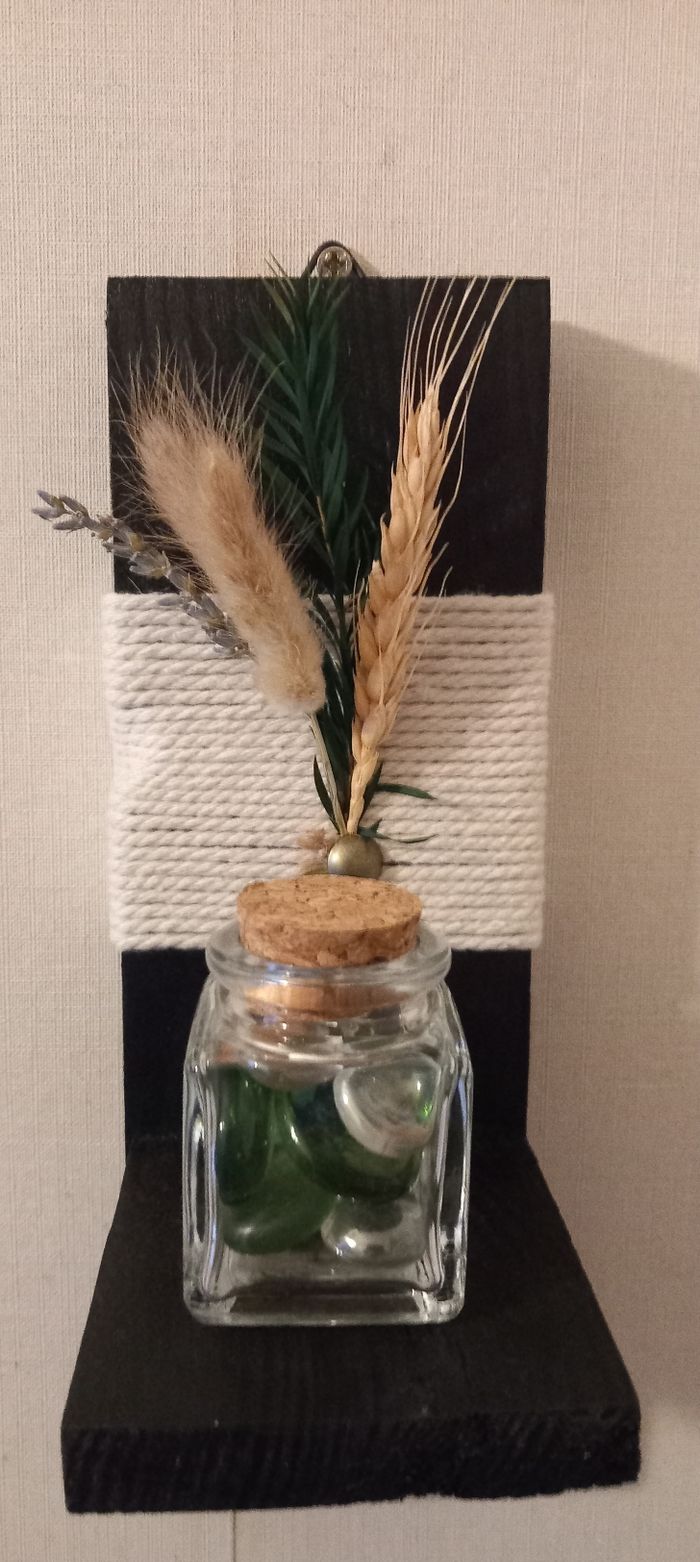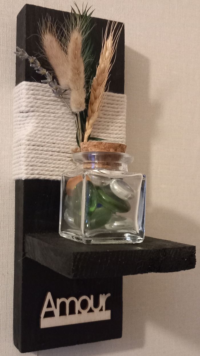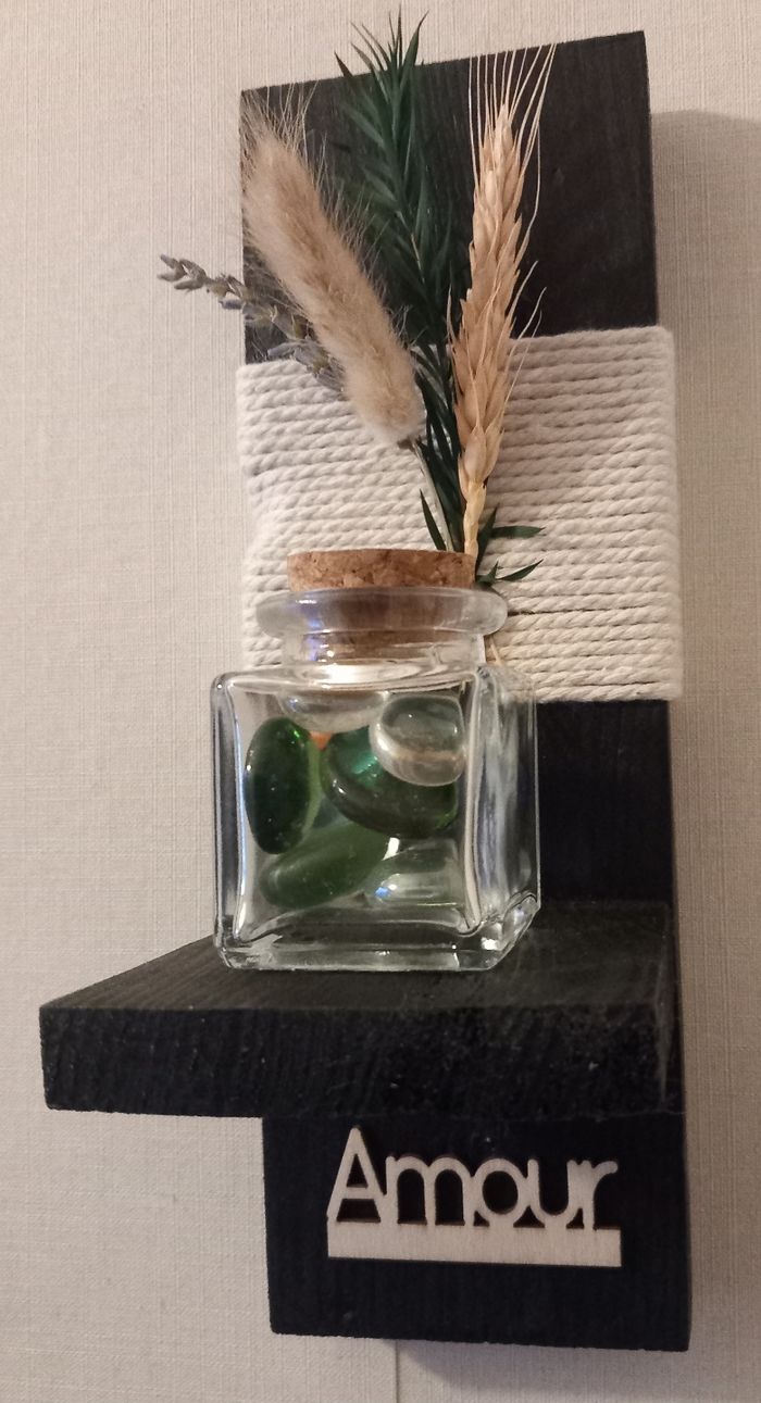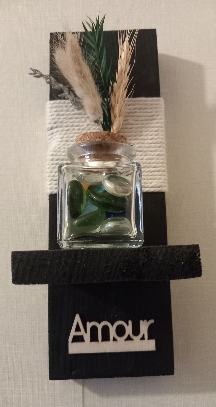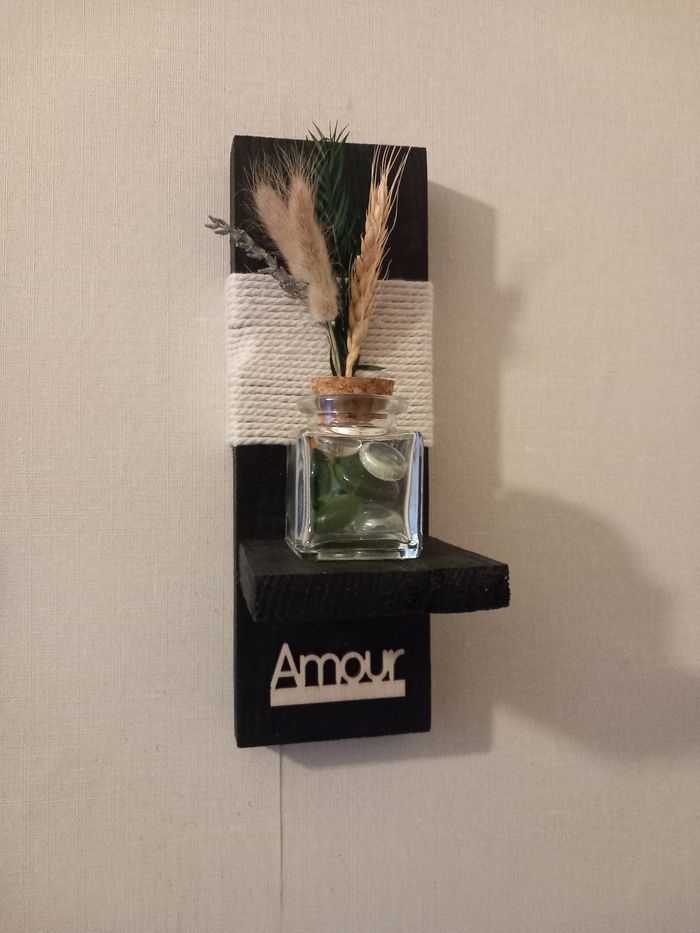 « 💗Amour suspendu » 🖐️ Descriptif Délicate et pleine de charme, cette décoration murale faite main apporte une touche bohème et naturelle à votre intérieur. Réalisée sur un support en bois noir, elle associe des matières brutes et chaleureuses : corde de coton enroulée à la main, petite étagère en bois, et flacon en verre fermé par un bouchon en liège. Le flacon contient une composition de pierres aux teintes douces et naturelles, évoquant la simplicité, la nature et la poésie du quotidien. Le mot « Amour », apposé en relief, vient sublimer l’ensemble avec une note tendre et intemporelle. Idéale pour décorer une entrée, un salon, une chambre ou offrir en cadeau, cette pièce unique s’intègre parfaitement dans une ambiance bohème, scandinave ou cosy. 📐 Dimensions 23,5 × 8 × 10 cm