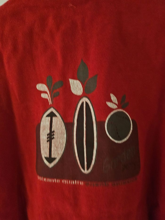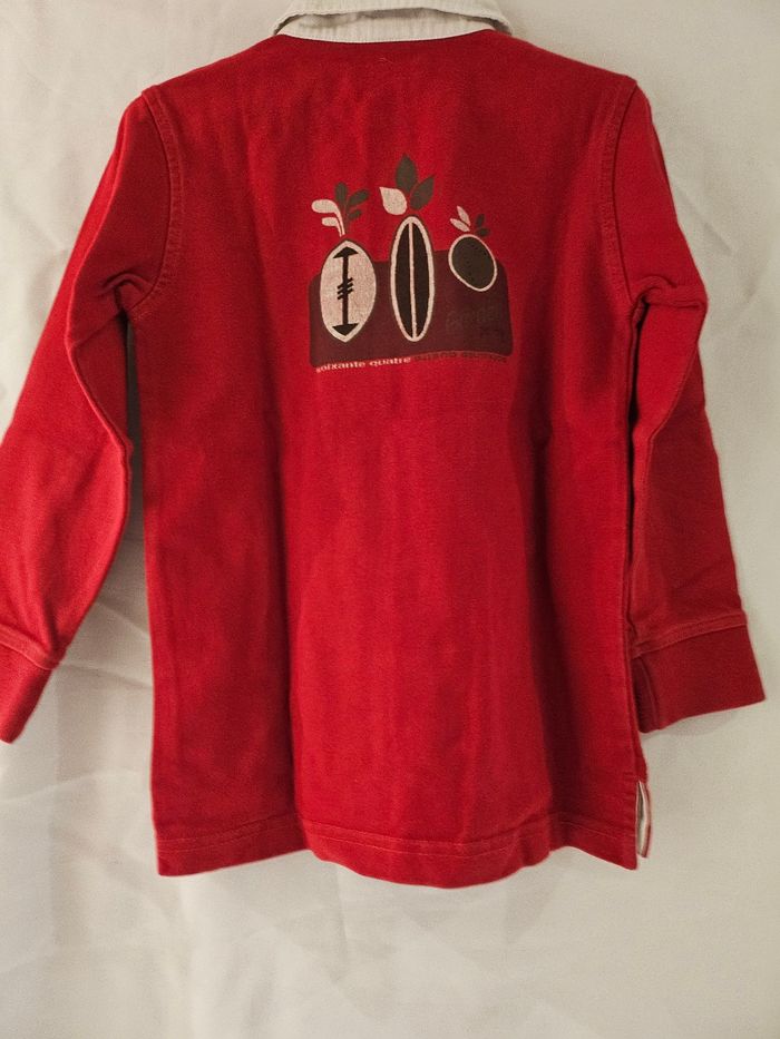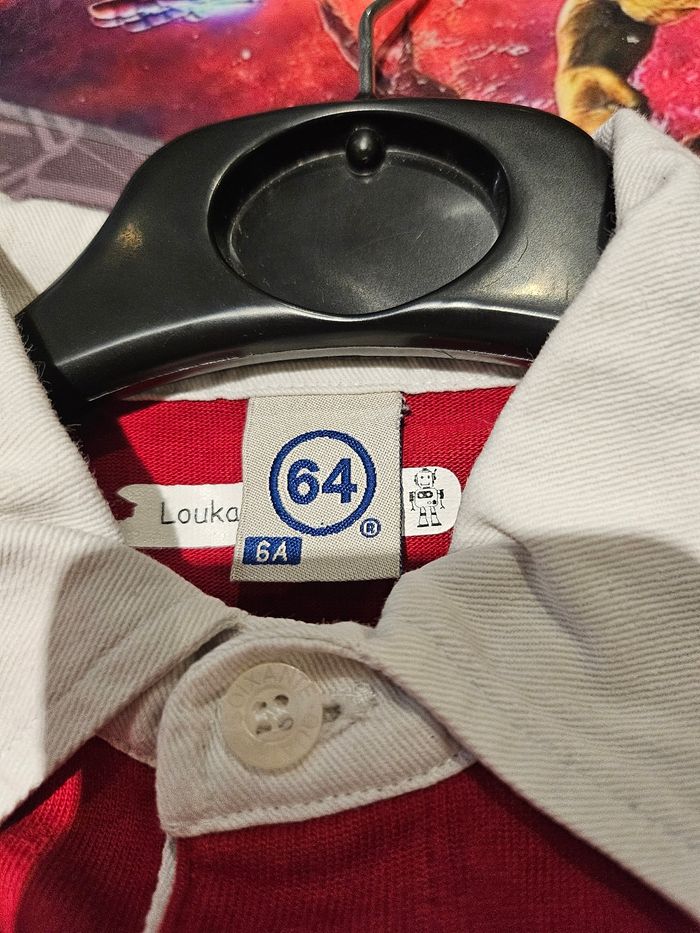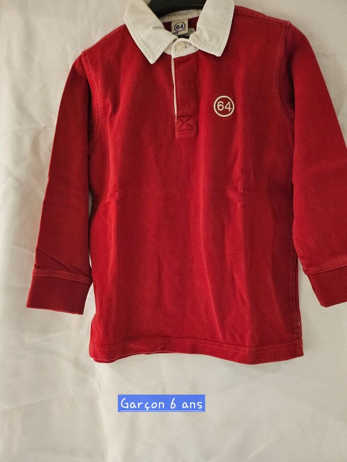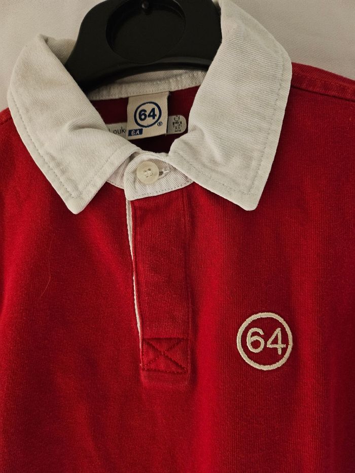 Polo manches longues rouge et blanc. Petite broderie sur la poitrine. Marque : 64 Taille : 6 ans