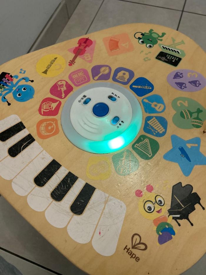 Table musical Hape en bois Chants , musique et instruments et lumières Entièrement tactile Plateau très rayé, beaucoup utiliser voir photos Fonctionne parfaitement Encore en vente à 100€ en magasin