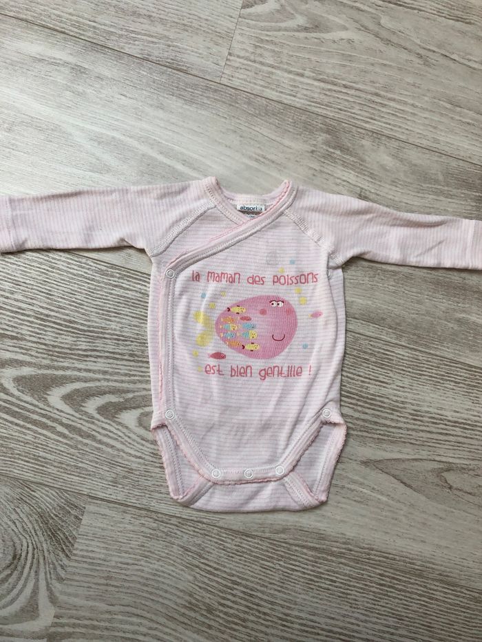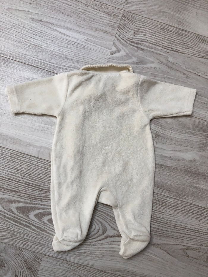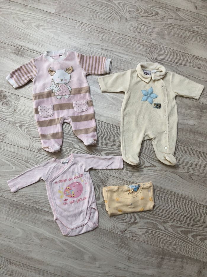 Petit lot naissance / 50 cm, comprenant: 1 pyjama chaud rayé à motif en très bon état sans trous ni taches.fermeture a pressions à l’arrière 1 pyjama chaud beige marque aubisou en très bon état sans trous ni taches. Fermeture à pression à l’avant. 1 body manche longue marque absorba en très bon état sans trous ni taches.fermeture pressions a l’avant. Je donne en plus un body jaune qui a un défaut au niveau des cuisses (couture qui se découd)