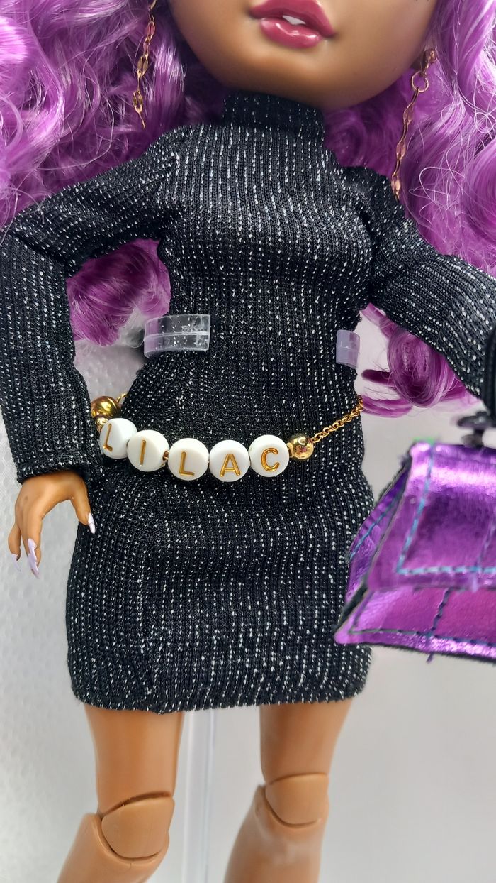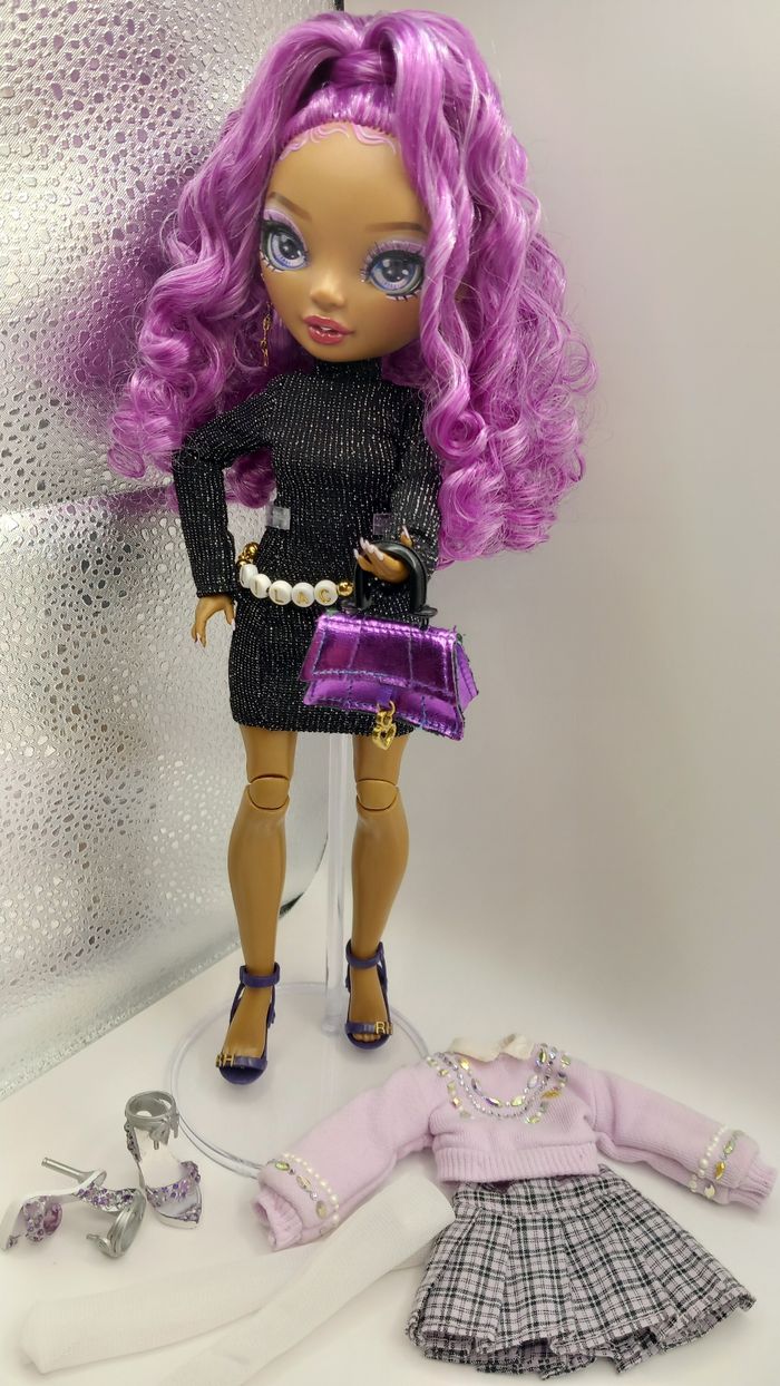Poupée rainbow high Lilac Lane avec 2 tenues, un sac, 2 paires de chaussures. Bijoux en métal dont ceinture avec son prénom. Envoi rapide et soigné
