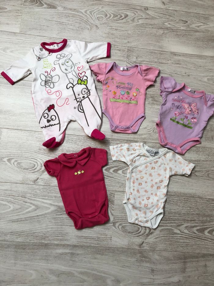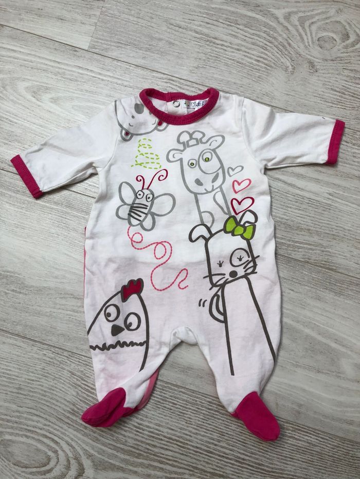 Petit lot en 1 mois comprenant: 1 pyjama fin blanc à motifs animaux marque kitchoun en très bon état sans trous ni taches. Fermeture pressions a l’arrière 2 body manches courtes marque tip&pit en très bon état sans trous ni taches. Fermeture pressions à l’entrejambe 1 body manche courte avec petit col marque mini Adelie en très bon état sans trous ni taches. Fermetures pressions à l’entrejambe et 3 à l’arrière 1 body manche courte blanc à motifs oursons marque Kiabi baby en très bon état sans trous ni taches. Fermeture pressions à l’avant