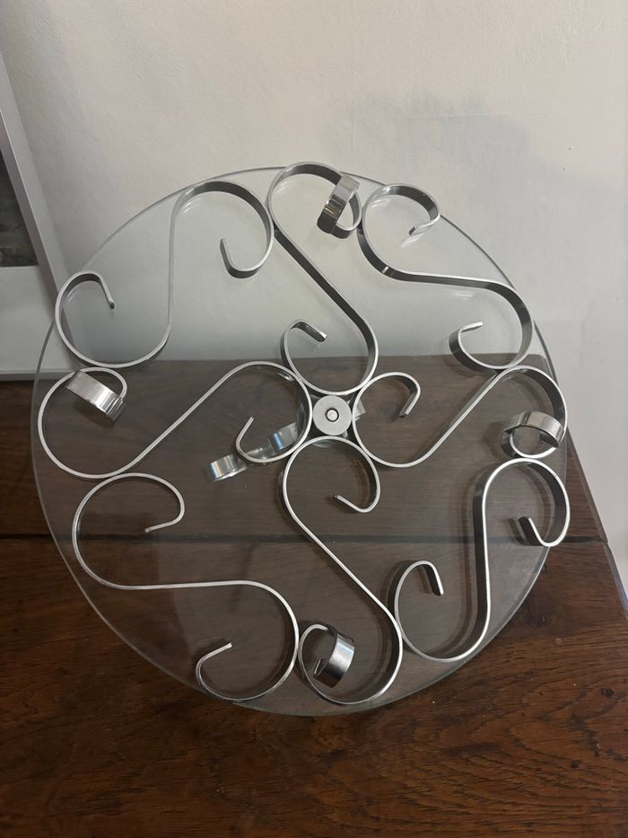 Joli plateau à fromage En verre épais et inox en forme d’arabesques En bon état, possibles micro traces sur le verre. Reste tout à fait esthétique et fonctionnel Diamètre 29 cm