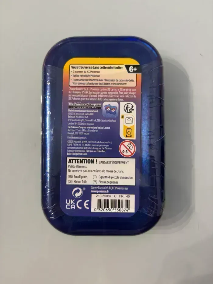 CONTENU DE LA MINI TIN : 2 boosters du JCC Pokémon 1 pièce Pokémon collector 1 carte Pokémon illustrée au design exclusif 1 Mini Tin en métal illustrée