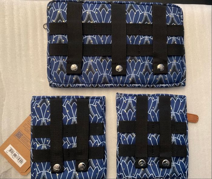 Lot pochettes, 1 avant médium et 2 latérales Marque Cabaia, modèle Schipfe La pochette avant médium est une ancienne, avec l’ancien logo et l’ancien intérieur et est neuve sans étiquettes Les 2 pochettes latérales sont récentes mais neuves avec étiquettes