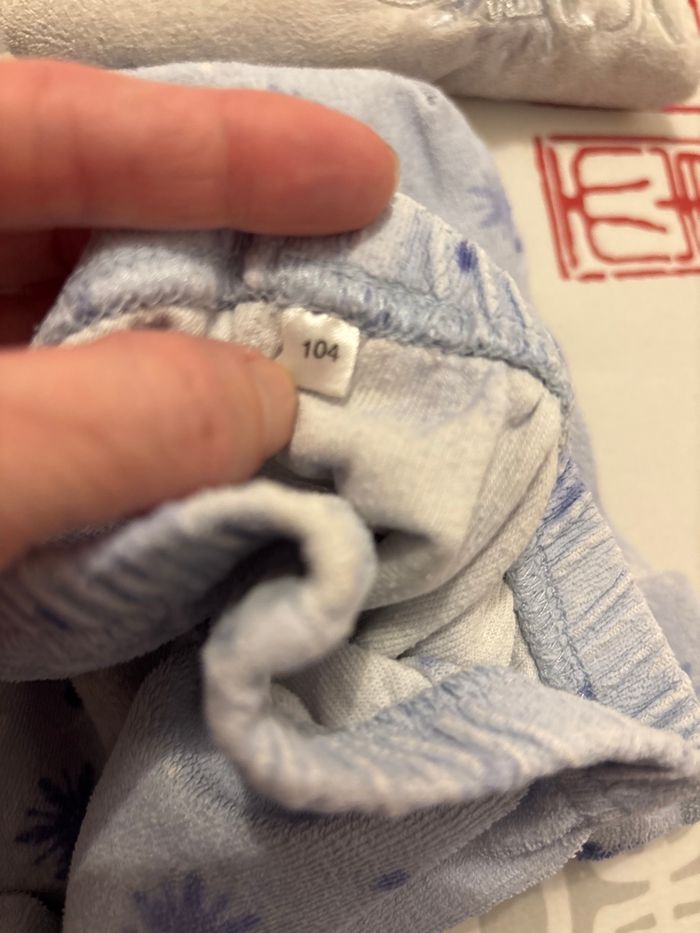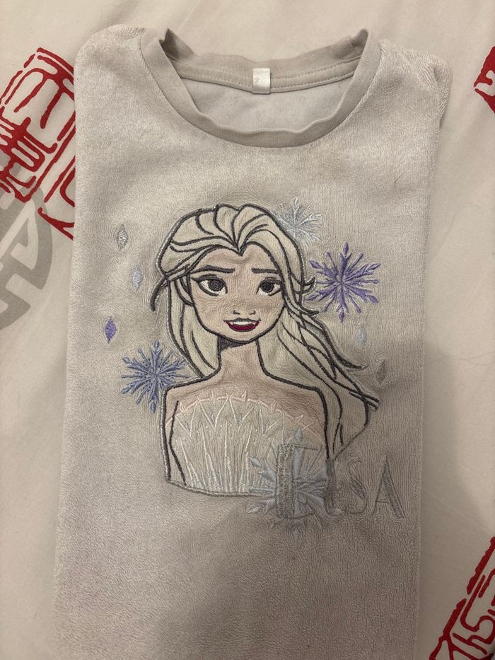 Pyjama La reine des neiges État général : le blanc n’est plus parfaitement blanc, l’image peut se plier après le lavage mais utilisable. Tissu un peu rêche Taille 104 cm