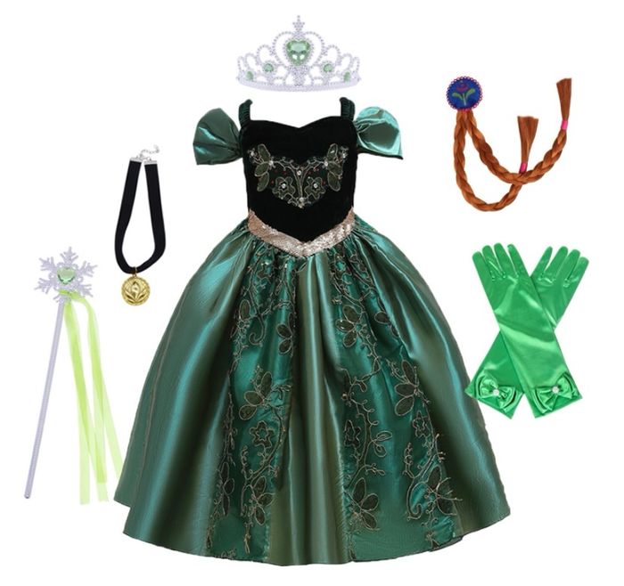 Déguisement robe de princesse verte et noire Anna et ces accessoires (couronne, baguette, gants, bijoux, tresse). 1 taille disponible : -4-5ans : longueur de la robe 80cm, Vendu dans leur pochette d’emballage d’origine, idéal pour faire un cadeau ! Expédition rapide après votre commande