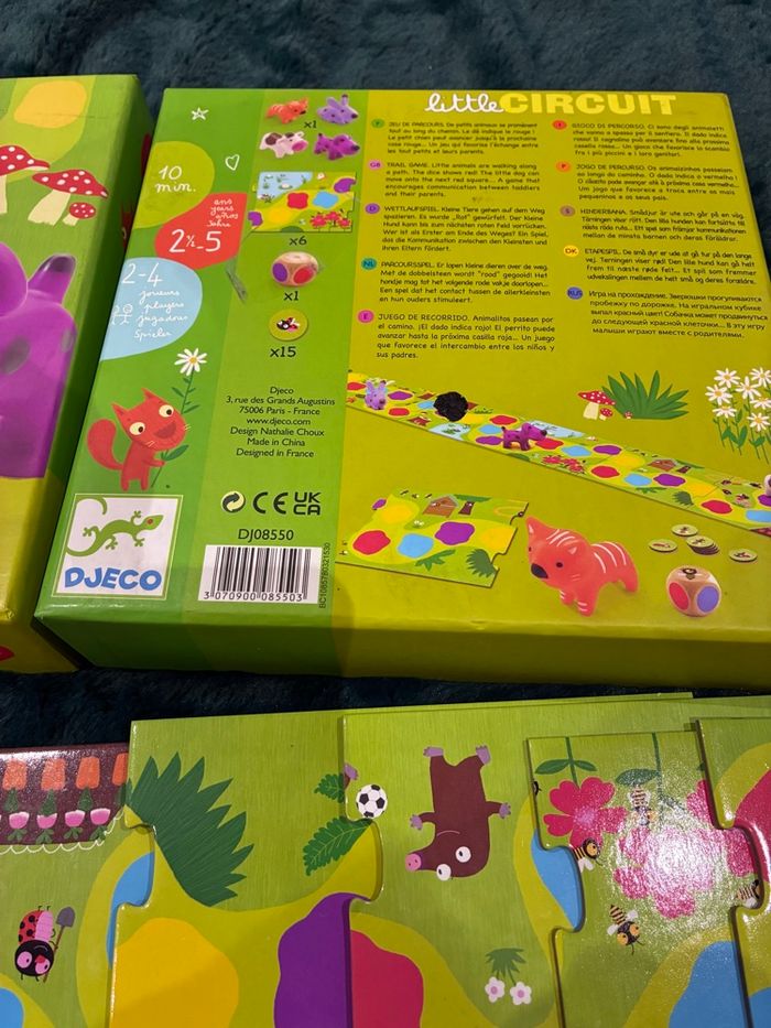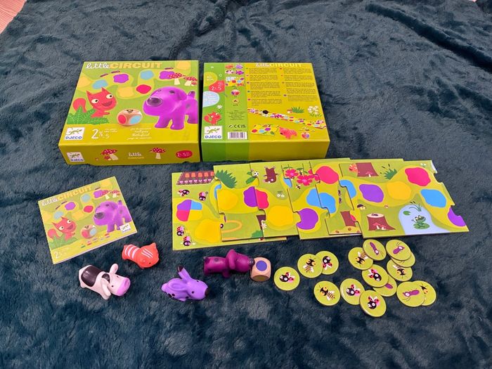 Marque DJECO Thème Animal Matériau Plastique Couleur Little Circuit JEU DE PARCOURS - De petits animaux se promènent tout au long du chemin. Le dé indique le rouge ! Le petit chien peut avancer jusqu’à la prochaine case rouge… Qui arrivera le premier au bout du chemin ? Un jeu qui favorise l’échange entre les tout petits et leurs parents. APPRENTISSAGE PAR LE JEU - Favorise la reconnaissance des couleurs, la manipulation d'un dé et les premiers concepts stratégiques chez les petits en s'amusant. Utiliser sous la surveillance d'un adulte, pour des sessions de jeu courtes (10 min). CONTENU - 1 plateau de jeu en carton de 6 pièces de puzzle à assembler, 4 figurines en plastique souple (chat, lapin, chien, vache), 1 dé en bois, 15 jetons en carton. Règle du jeu en 10 langues. MAITRISE RAPIDE - Jeu conçu pour être facilement compris par les enfants dès 2,5 ans, avec un gros dé coloré et des règles simples pour un amusement immédiat. Un jeu de parcours idéal pour des moments de complicité et d'échange entre enfants et parents, renforçant les liens familiaux. MADE IN FRANCE - Ce jeu garantit une haute qualité avec des figurines en plastique souple, un carton épais et un dé robuste pour une durabilité maximale boite légèrement tachée