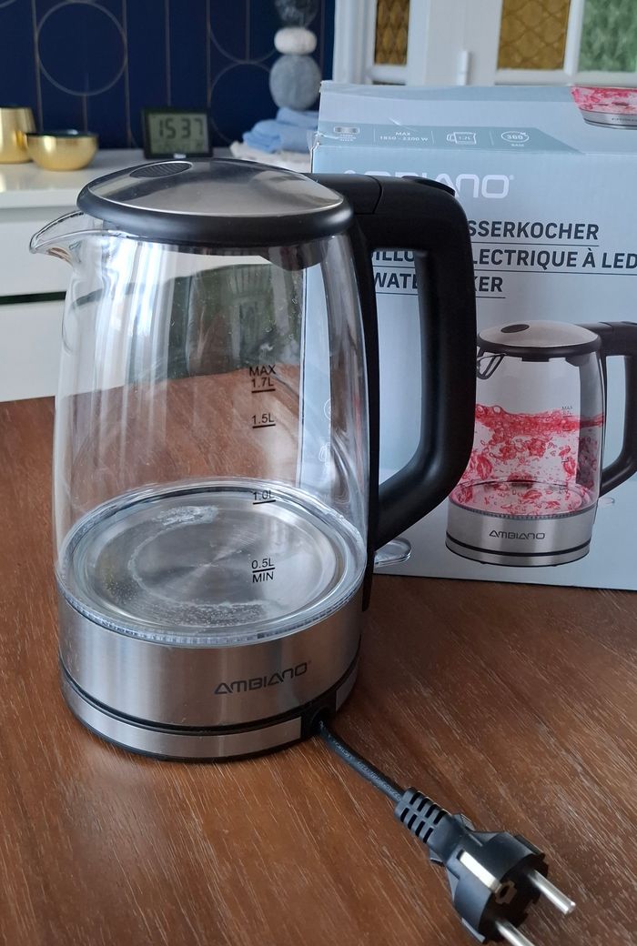 bouilloire électrique AMBIANO à led, en verre et acier inoxydable, capacité 1,7 litres, bon état mais l'arrêt automatique ne fonctionne plus