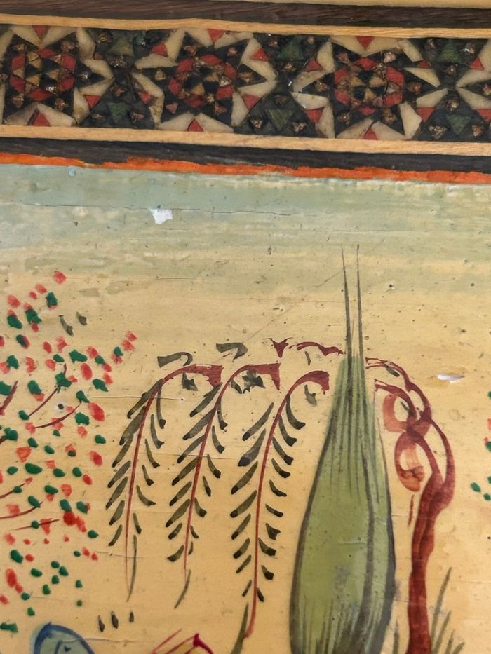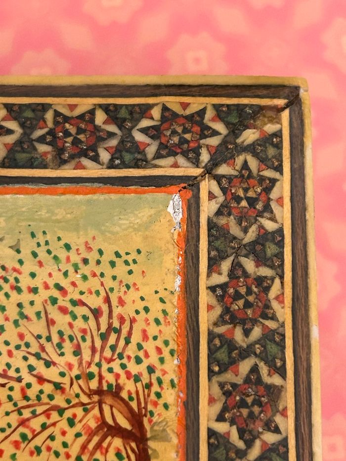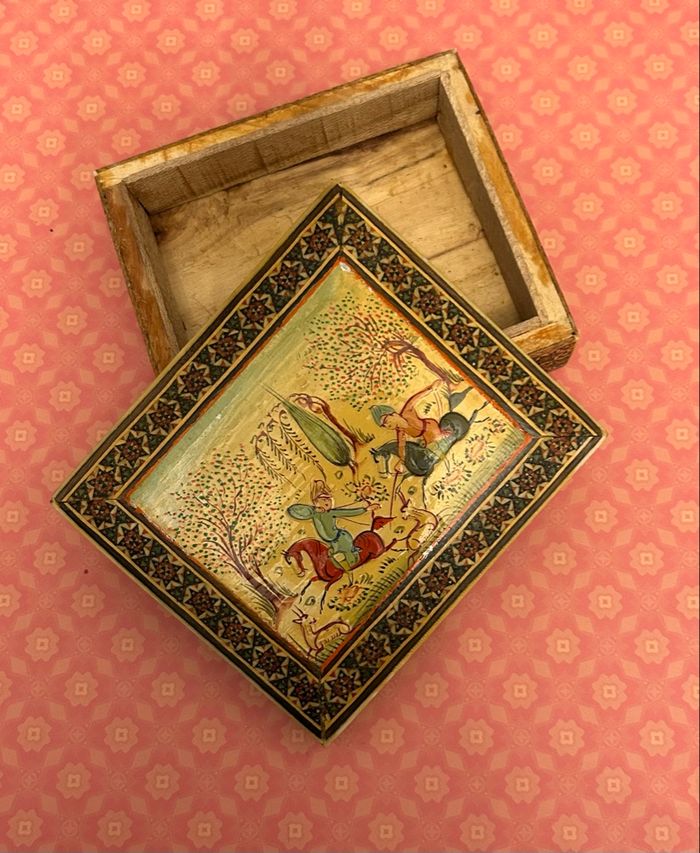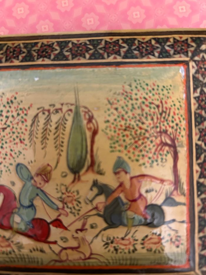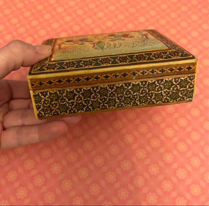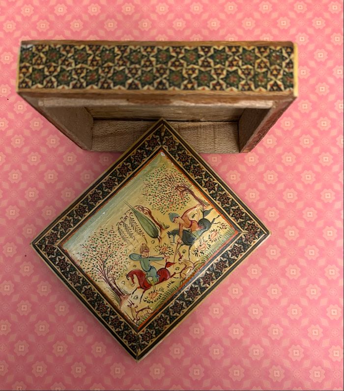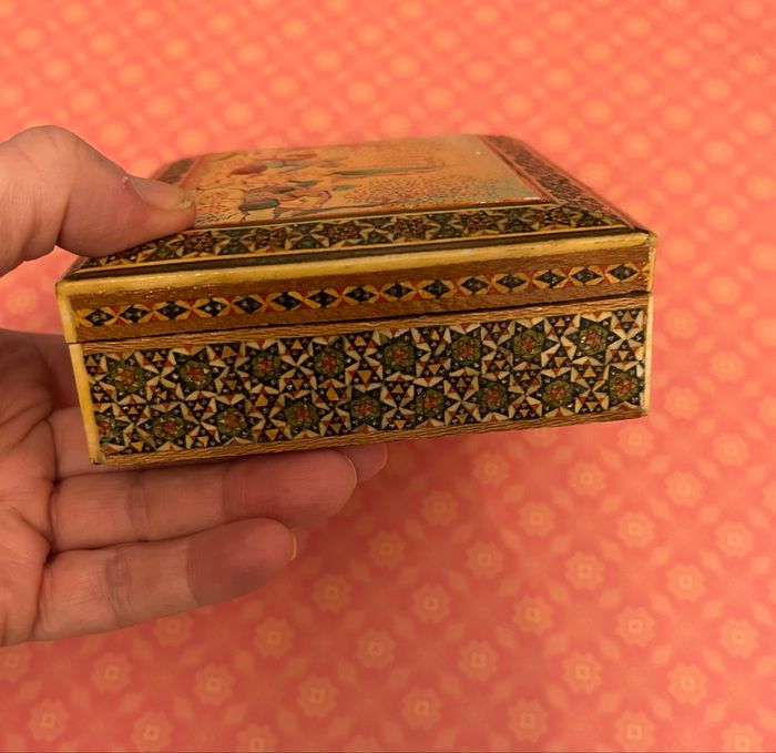 Je vends cette boîte en bois perse, vintage, esprit marqueterie de katham dimensions ; 12 × 10,5 × 3,5 cm bon état. Représente une scène de chasse persane Toutefois, je précise qu’il y a deux petits éclats, voir photos, envoi rapide et soigné