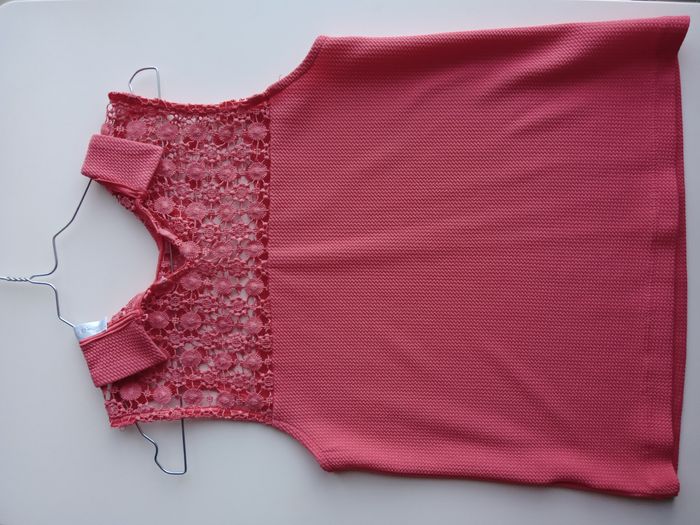 Joli top habillé, avec une maille ajourée et un col claudine se fermant avec un bouton au dos, neuf, couleur corail J'ai 3 couleurs du même modèle tous de la même taille 2, je n'ai jamais pu les mettre, je suis tombée enceinte 😅. Se met aussi bien avec un jean, qu'avec un pantalon chic ou une jolie jupe