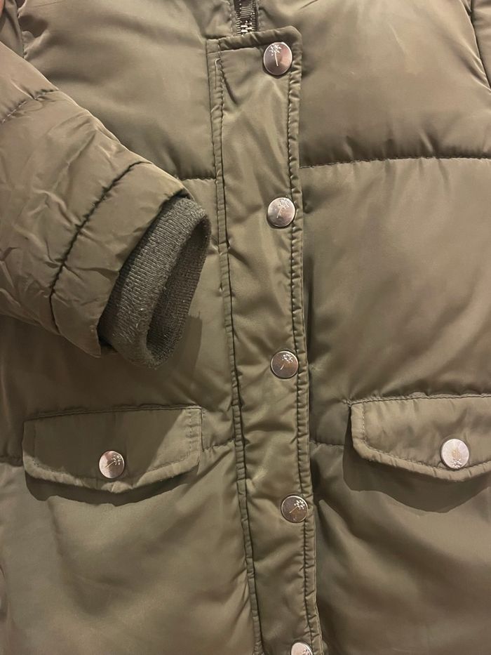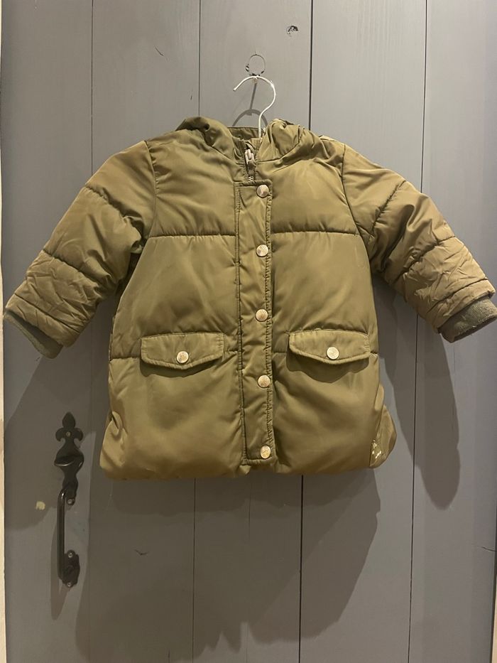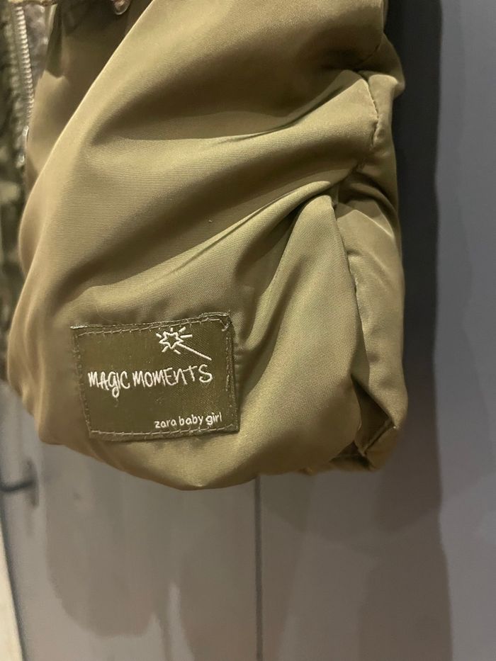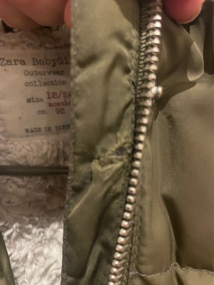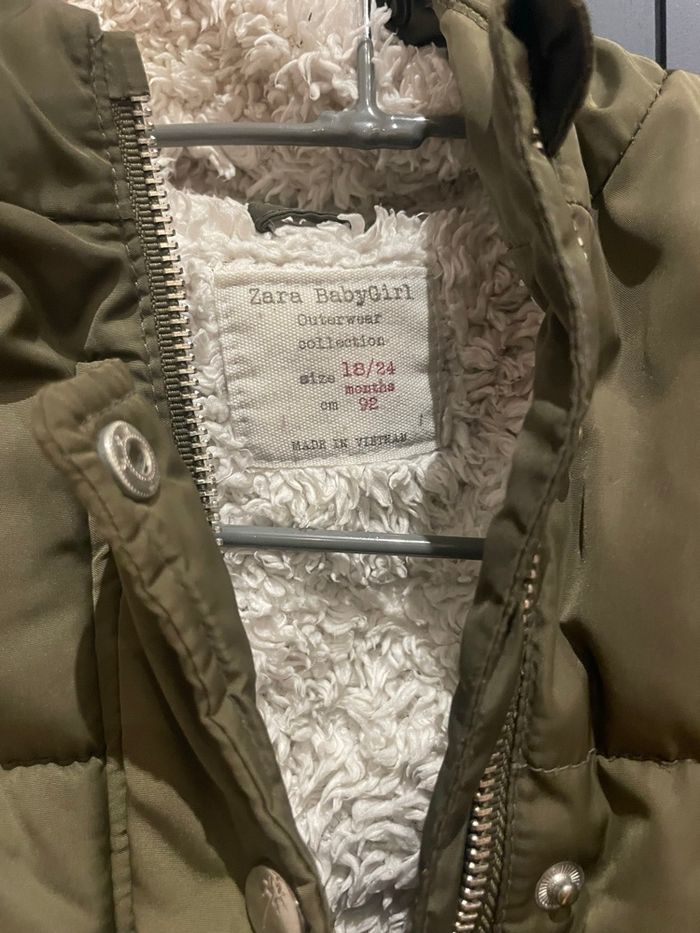Manteau Zara chaude avec capuche bien chaude, manche élastique, détail ouverture sur le côté pour plus de mouvements taille 18-24 mois/92 cm - petit accro sur la bande intérieure à côté du zip réparée mais présente - super stylée