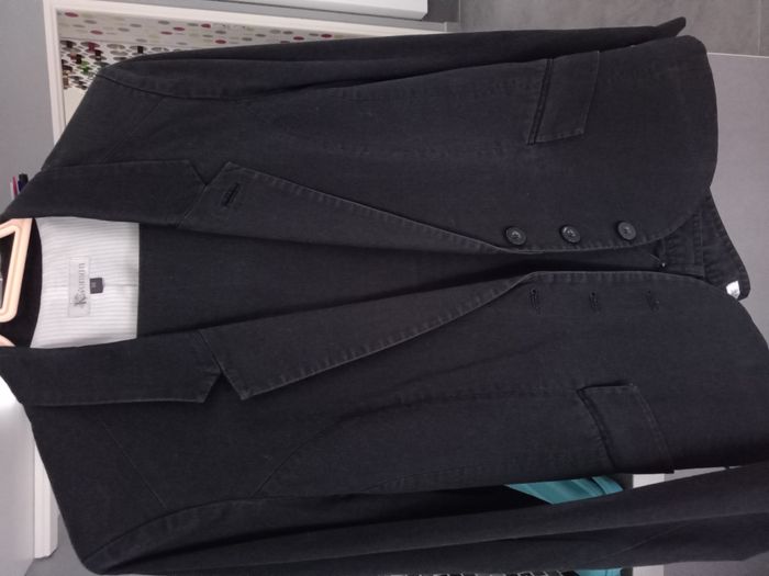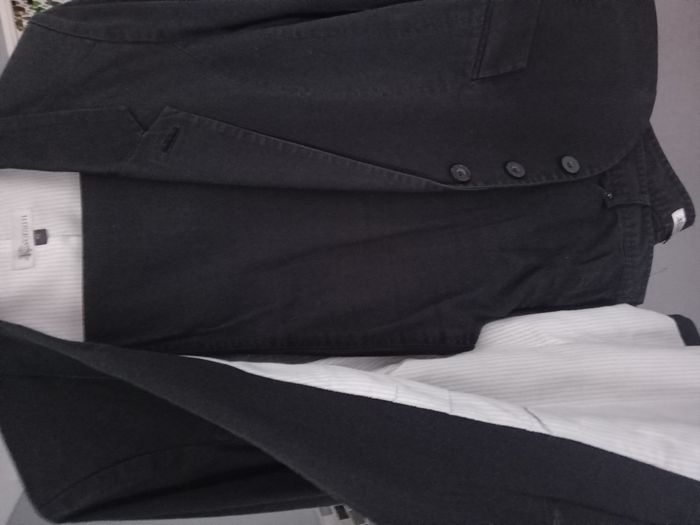 Ensemble veste et pantalon de tailleur noir, veste blazer fermeture à 3 boutons, poches à rabats, pantalon coupe droite noir. En très bon état N'hésitez pas à me donner des informations, mesures, je réponds à toutes les questions.