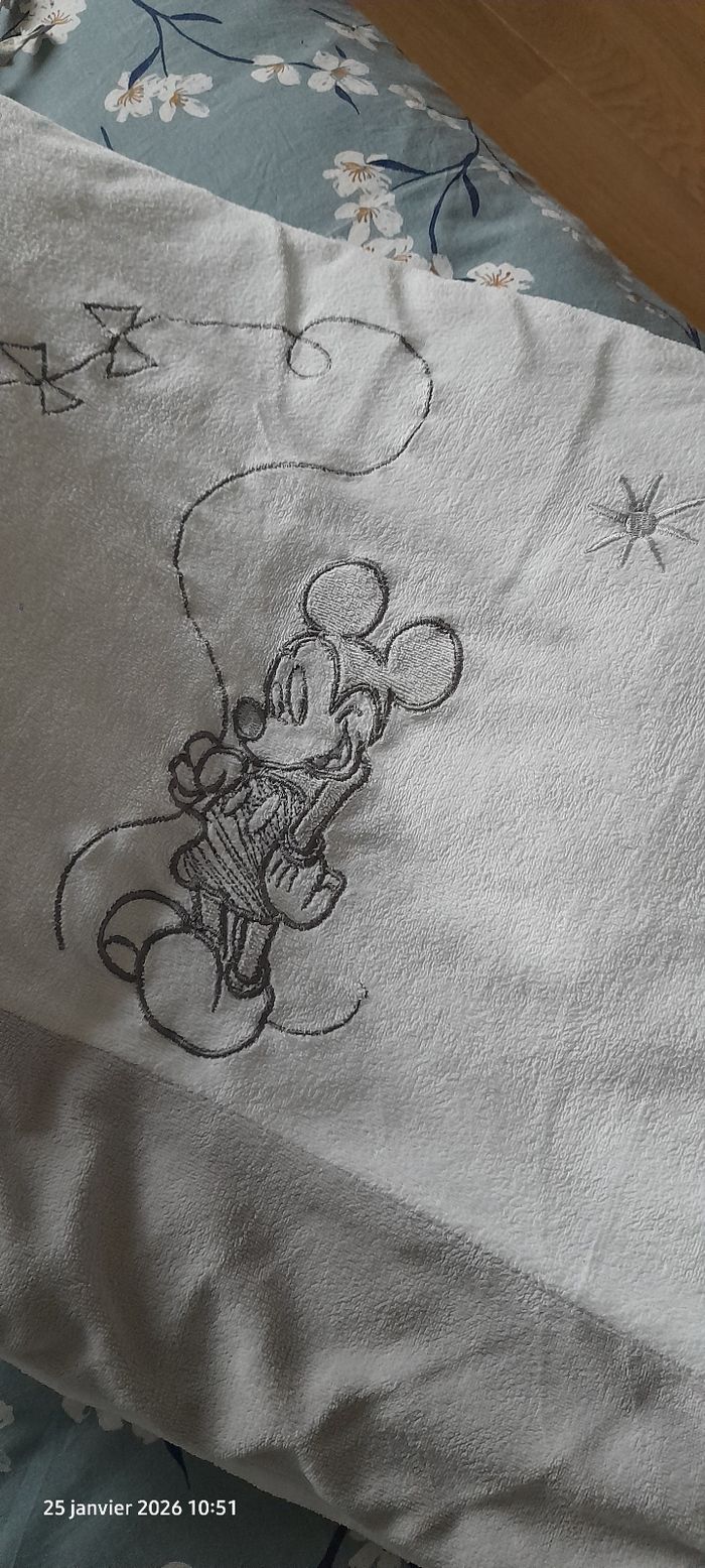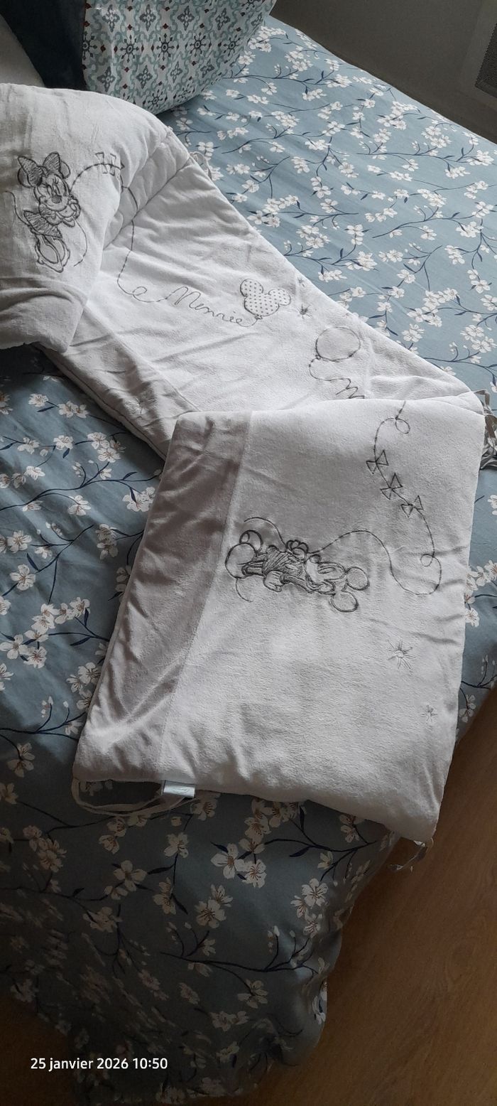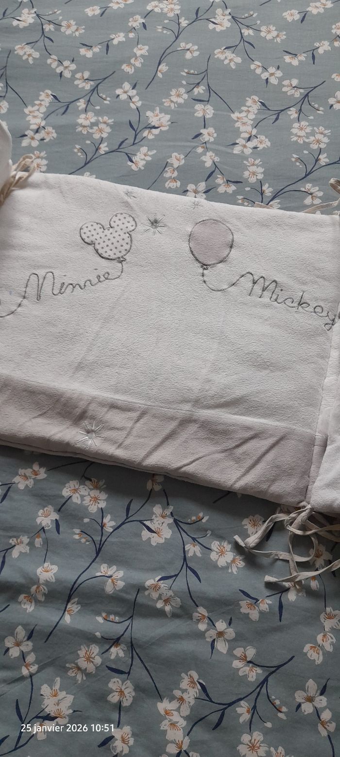 Ensemble couette et contour de lit assorti pour lit bébé. Thème indémodable Mickey et minnie. En polaire tout doux blanc et gris clair. Lavable en machine. Marque Disney. Pour fille et garçon.
