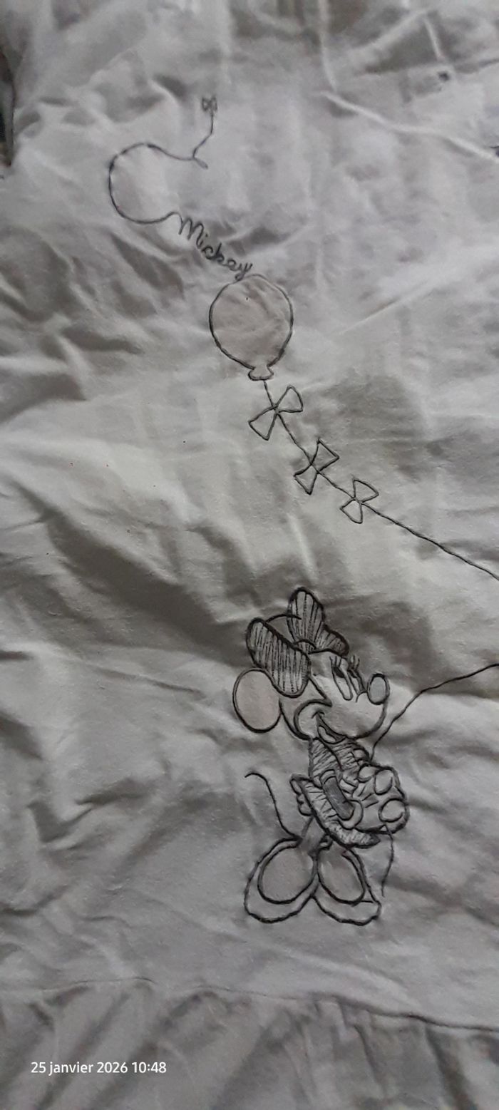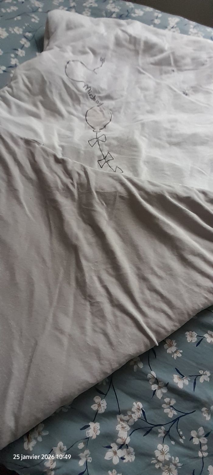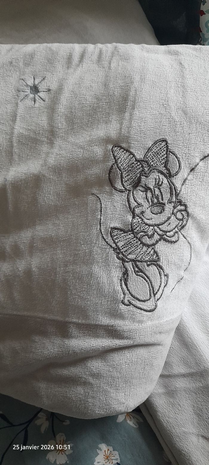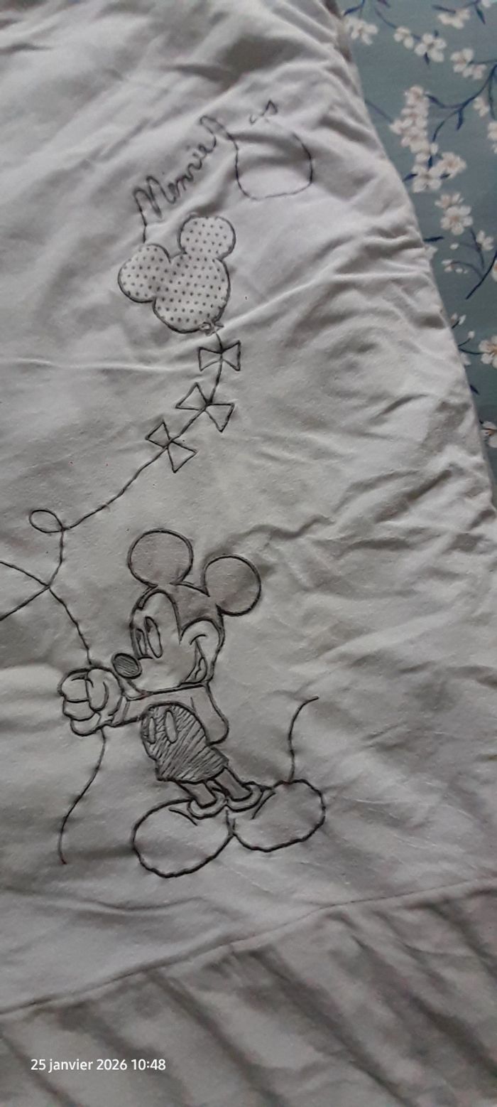 Ensemble couette et contour de lit assorti pour lit bébé. Thème indémodable Mickey et minnie. En polaire tout doux blanc et gris clair. Lavable en machine. Marque Disney. Pour fille et garçon.