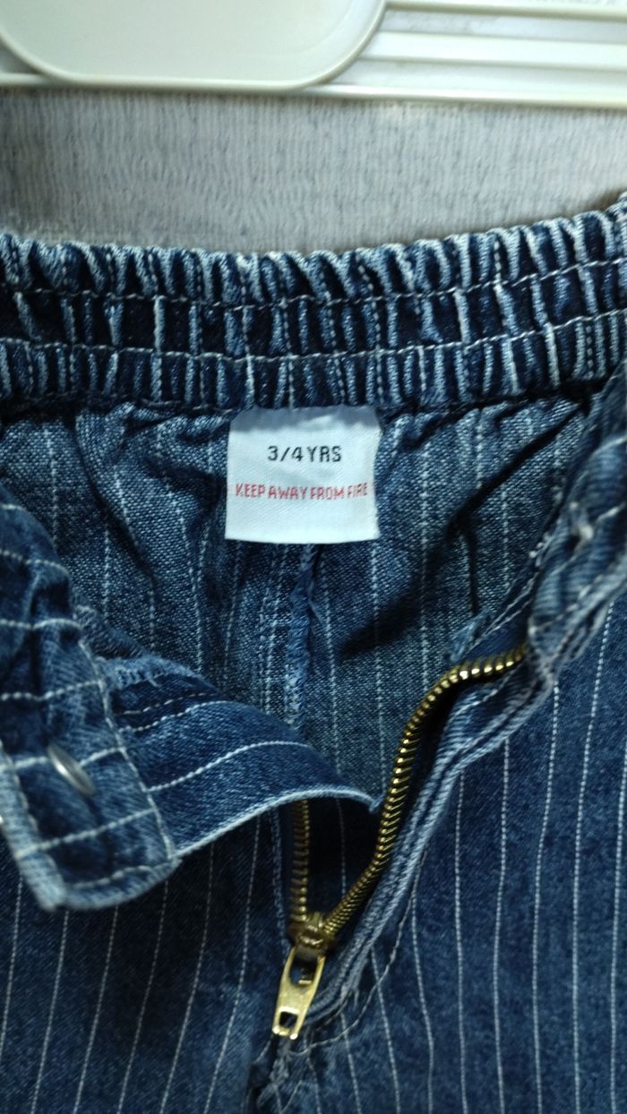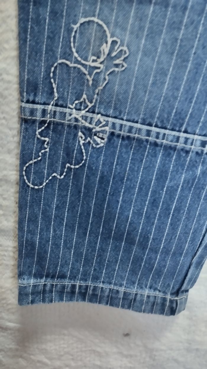Jean enfant bleu à fines rayures blanches. Coupe droite, taille 3 ans, avec bouton et passants pour ceinture. Broderie d’un enfant jouant au ballon sur la jambe. Très bon état, porté avec soin. Sans marque.