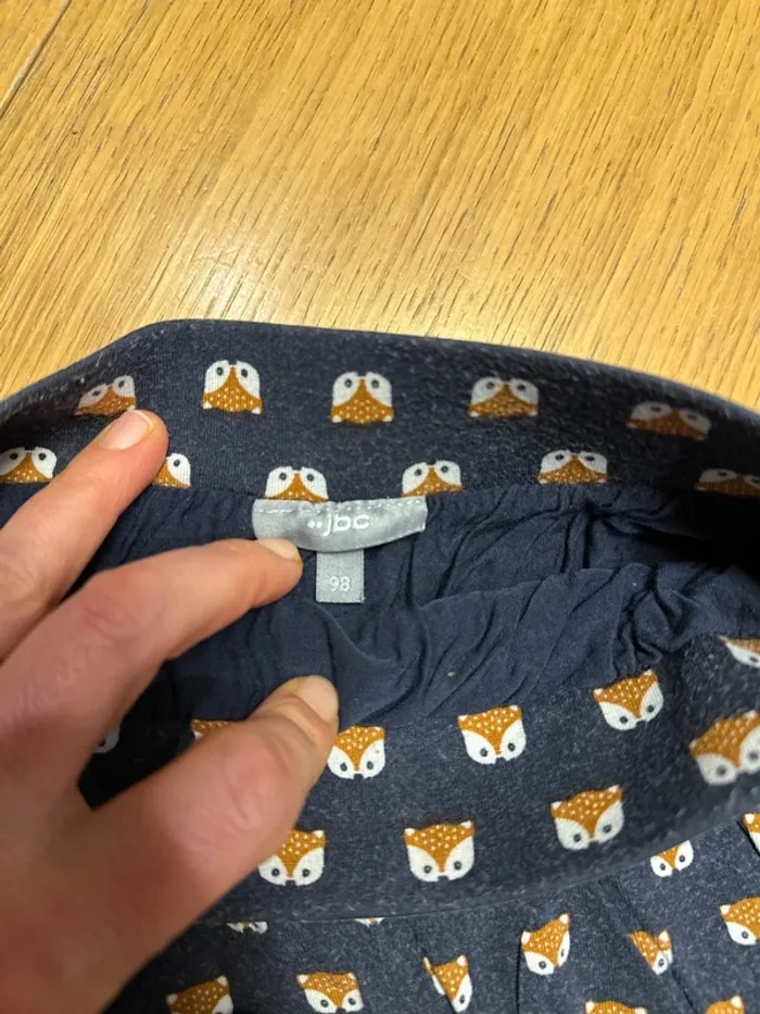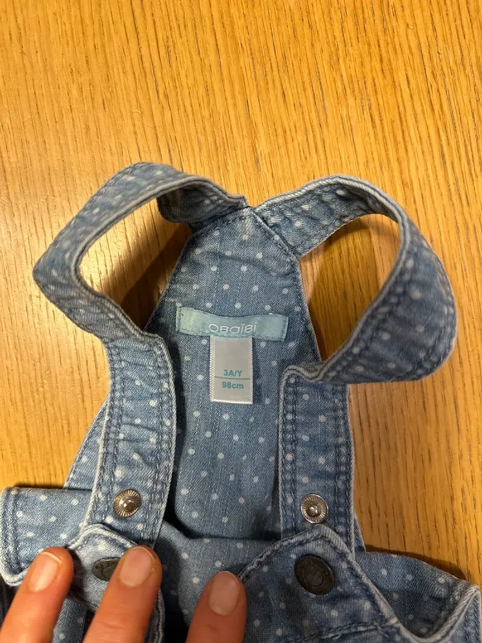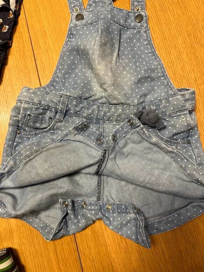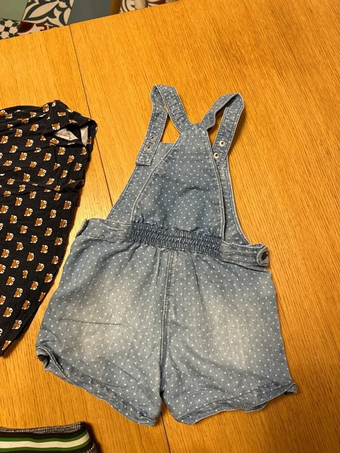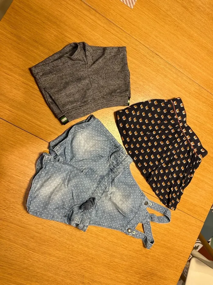 1 jupe JBC bleu marine renard, taille élastique 1 short à carreaux avec taille à l élastique vert blanc et noir 1 salopette en Jean’s petit pois avec bouton pression à l entre jambe