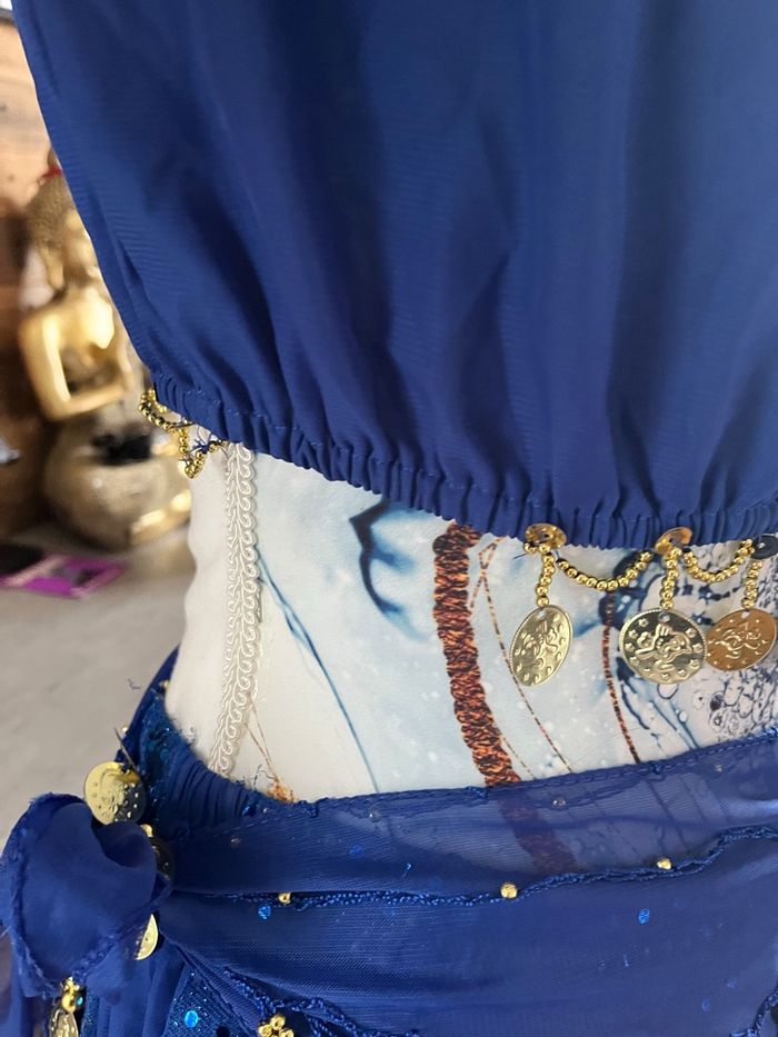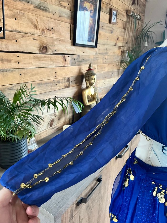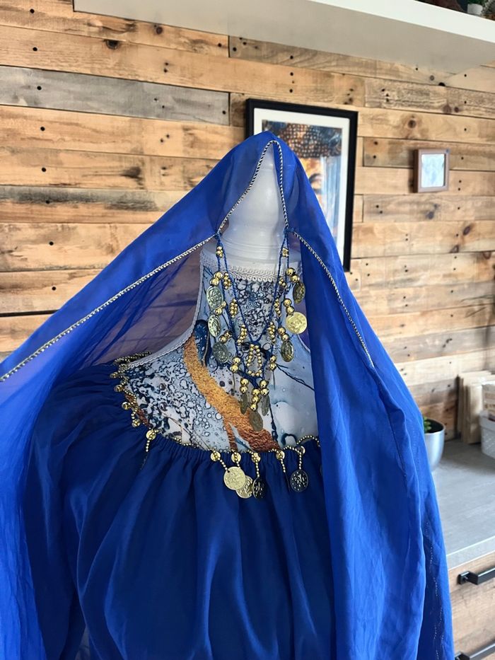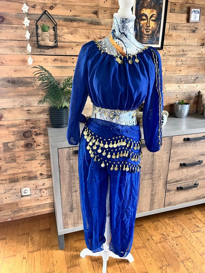 Il est peut manquer quelques perles sur le haut , mais rien de méchant il est en excellent état composé de quatre pièces, le pantalon , la ceinture, le haut a manches ouvertes et le chale sur la tête taille unique Tres jolie tenue pournle carnaval par exemples