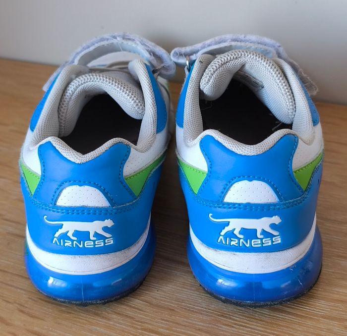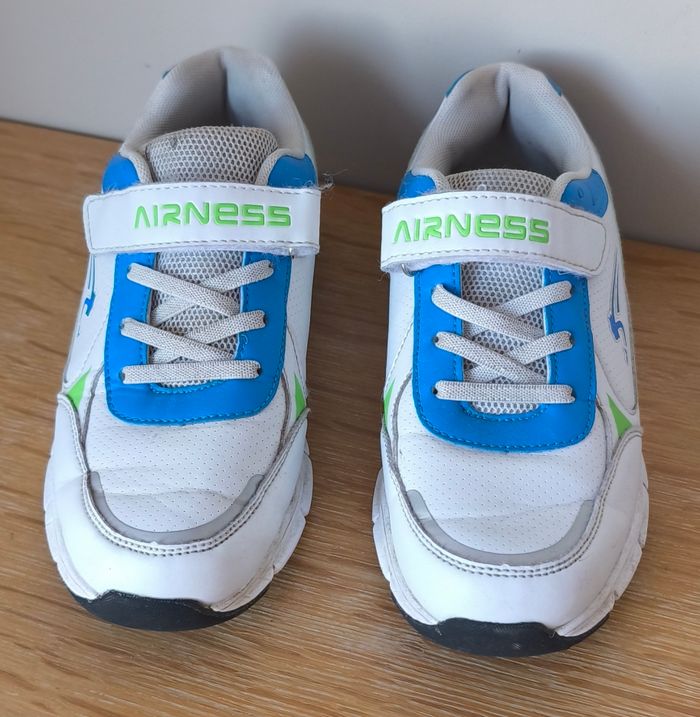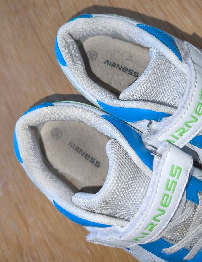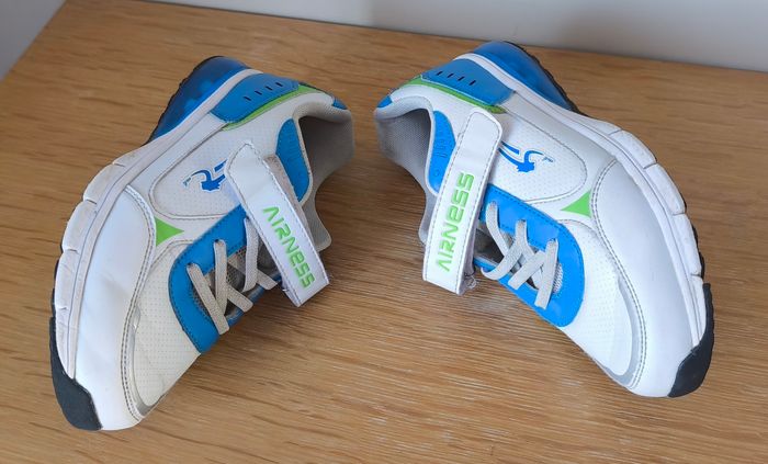 Baskets de la marque AIRNESS - Blanc et bleu - A scratch et lacets élastiques - Cuir synthétique - Pointure : 35 ℹ️ Bon état, car le blanc a perdu de sa blancheur Seront netoyées pour la vente #kat02600chaussuresgarcon35 #airness #basketgarcon35 #basketairness35 #chaussuresgarcon35