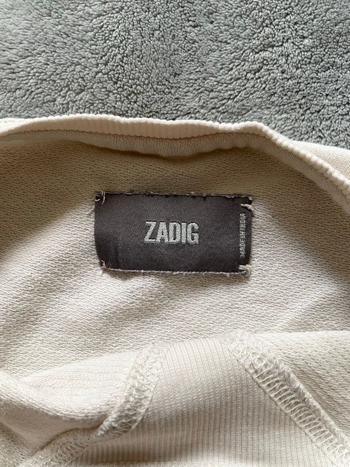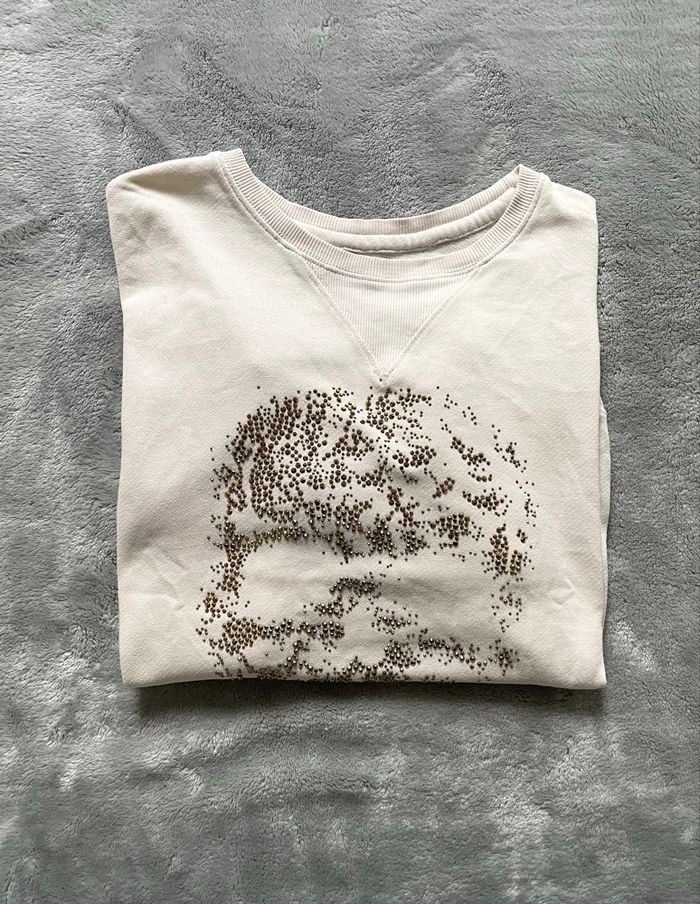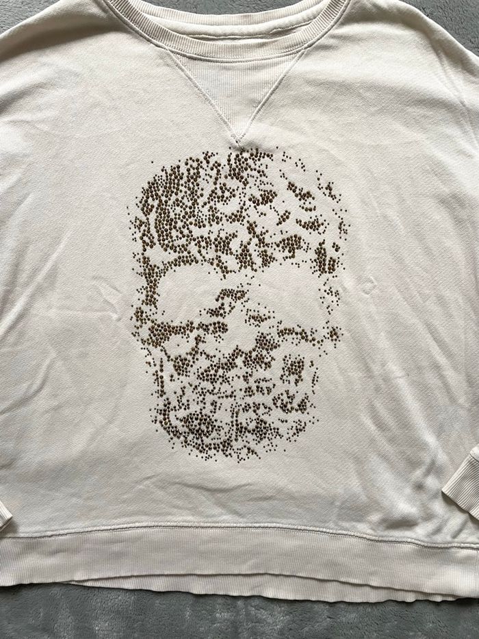 l'iconique sweat Zadig & Voltaire en coloris écru / blanc cassé. Une pièce forte au style rock chic affirmé. Design Signature : Motif Skull : Tête de mort réalisée en paillettes délicates pour un effet brillant subtil. Manches Travaillées : Superbes détails ajourés et brodés sur toute la longueur des bras, signature haut de gamme de la marque. 📏 Taille : S (36). Coupe confortable et moderne. 🌿 Matière : Coton léger et agréable, idéal en toute saison. ✅ Très bon état général. ⚠️ Note : Un léger délavage est à noter sur le bas des manches (voir la dernière photo), pris en compte dans le prix.