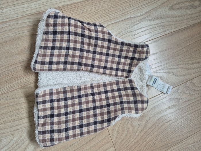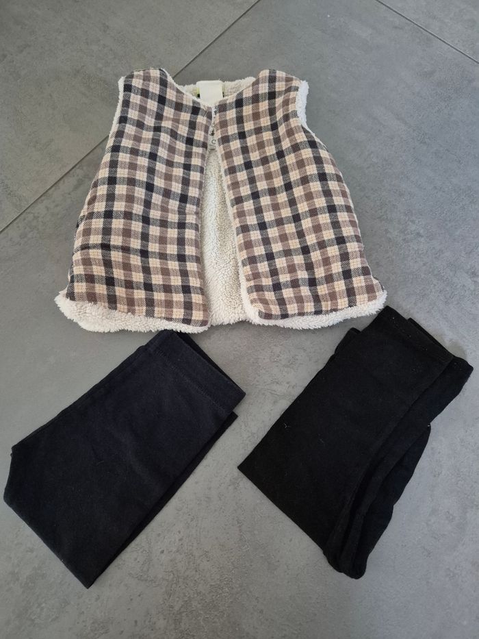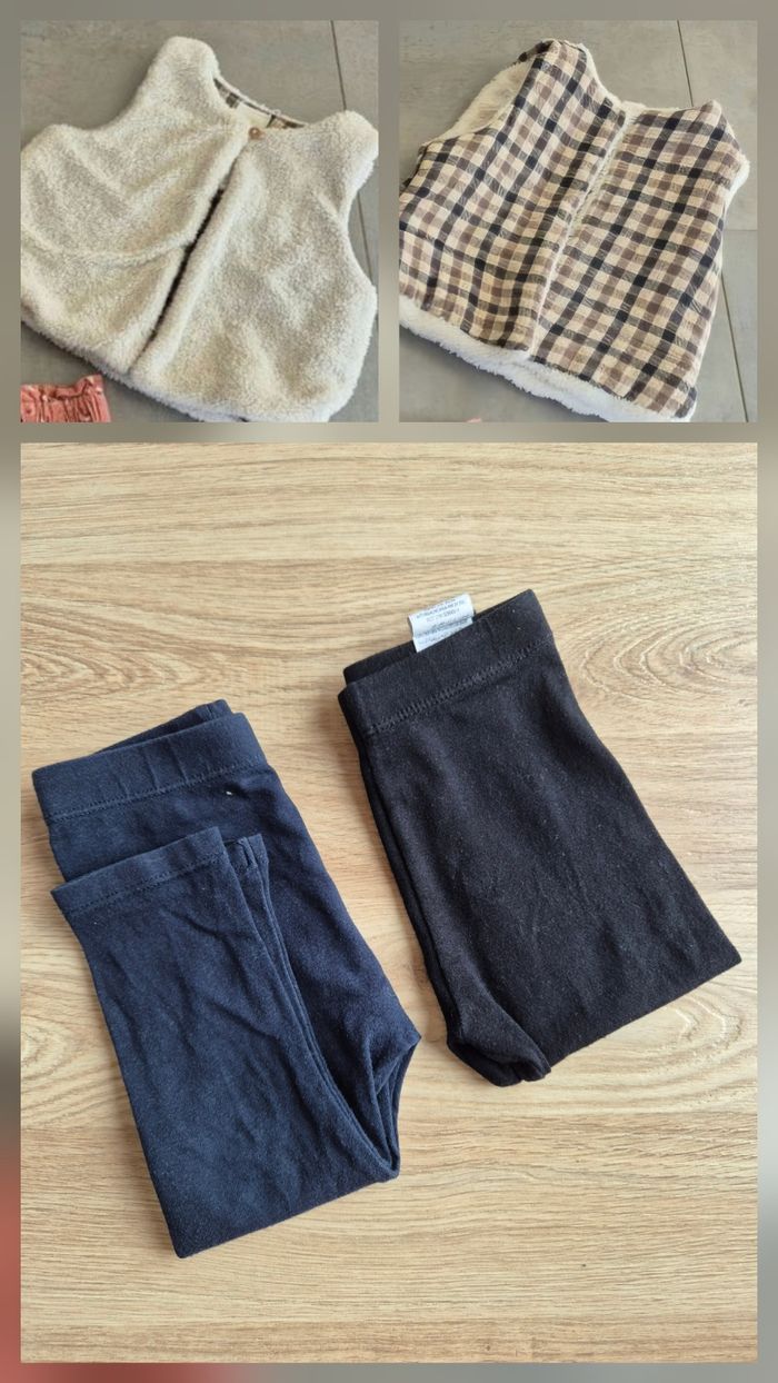 Gilet sans manches réversible Tape A l'œil. 2 leggings kiabi noir et marine. Le tout en très bon état et 18 mois.