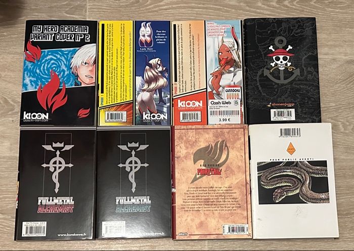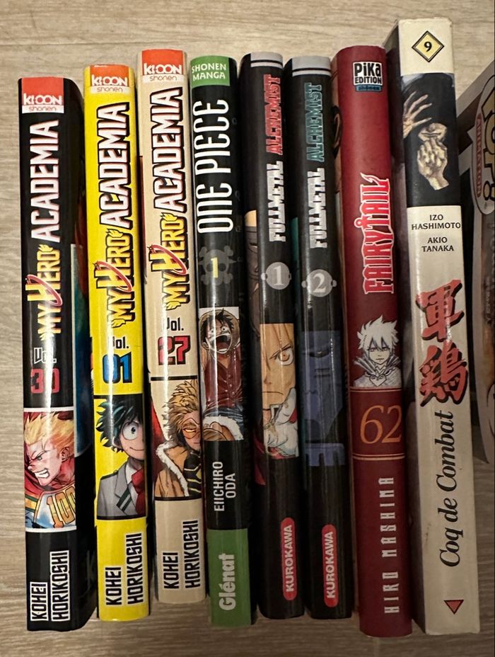 Bonjour, je vend ce lot de manga. Ils sont tous en très bonne etat. Il y a le 1,27 et le 30 collector de my hero academia, Le tome 1 de one piece, le tome 1 et 2 de full métal alchemist, le tome 62 de Fairy tail et le tome 9 de la vielle édition (plus éditer) de coq de combat.
