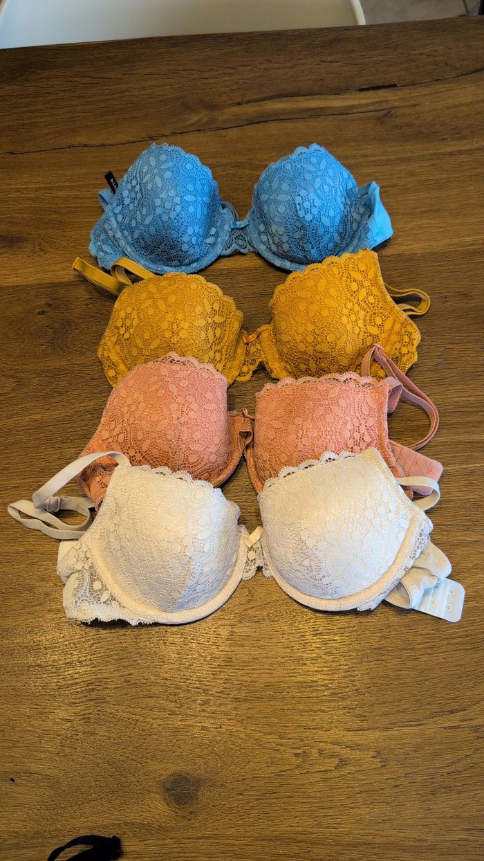 Lot de 4 soutien-gorges, marque Kiabi. Taille 85B. En très bon état. Les étiquettes de taille ont été découpées mais j'ai le ticket d'achat, c'est bien du 85B.
