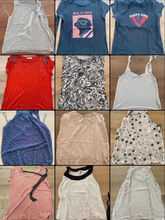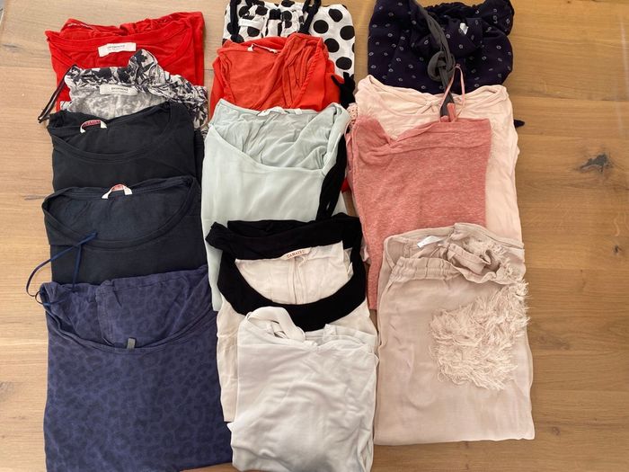 Lot de 15 t-shirts femme taille L en très bon état général. Marques principales : Promod, Camaïeu, nafnaf Couleurs variées : rouge, noir, bleu marine, vert d’eau, rose, beige, blanc, etc. Matières légères et agréables à porter, parfaites pour la mi-saison ou l’été. 🧺 Tous lavés et prêts à porter. ⸻ 📏 Taille : L / 42 🧵 État : bon état et très bon état