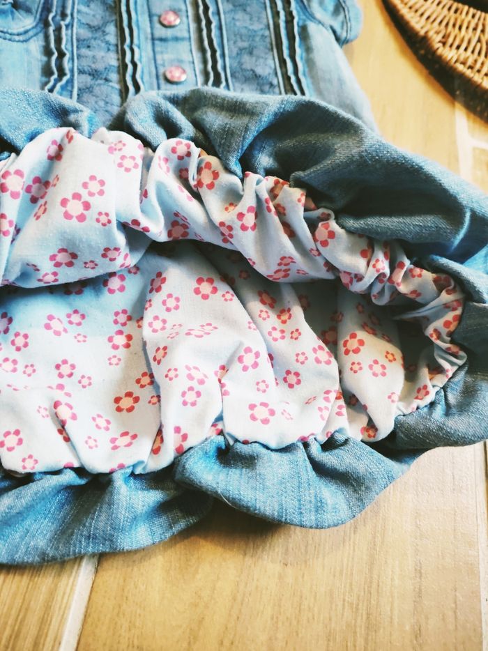 👗Orchestra/baby girl - Robe en jean bouffante manches courtes - Taille 6 mois REF04 🎀Jolie robe en jean avec ✨Effet bouffant et intérieur doublé tissu bleu clair avec fleurs ✨4 boutons pressions sur le devant motifs fleurs ✨Bandes dentelles et volants ✨Col Claudine ✨Passants pour mettre une ceinture ✨Matière étiquette non disponible ❇️N'hésitez pas à créer un lot pour économiser sur les frais de port❇️ Robe hiver bébé, robe automne fille, robe à volants, robe froufrous, robe grise, robe à pois, robe bébé, robe longue bébé, robe à motifs