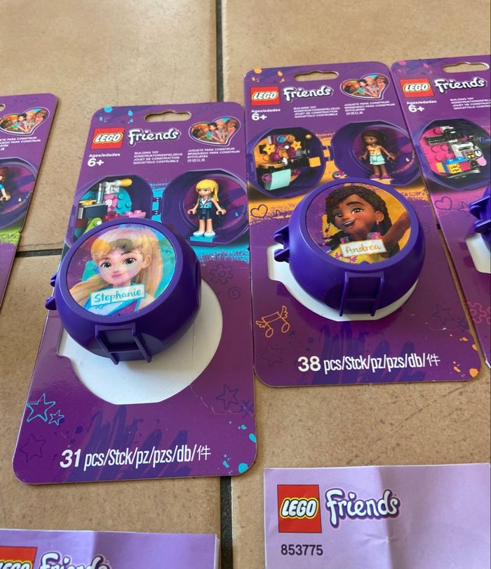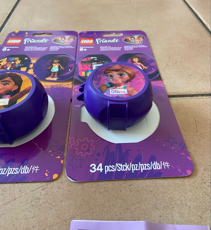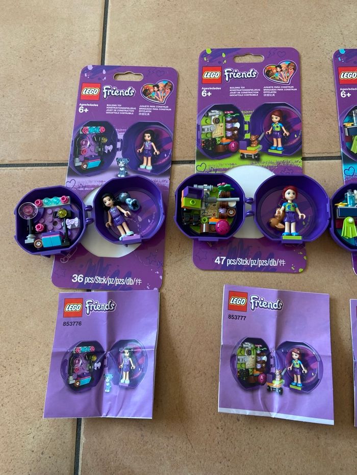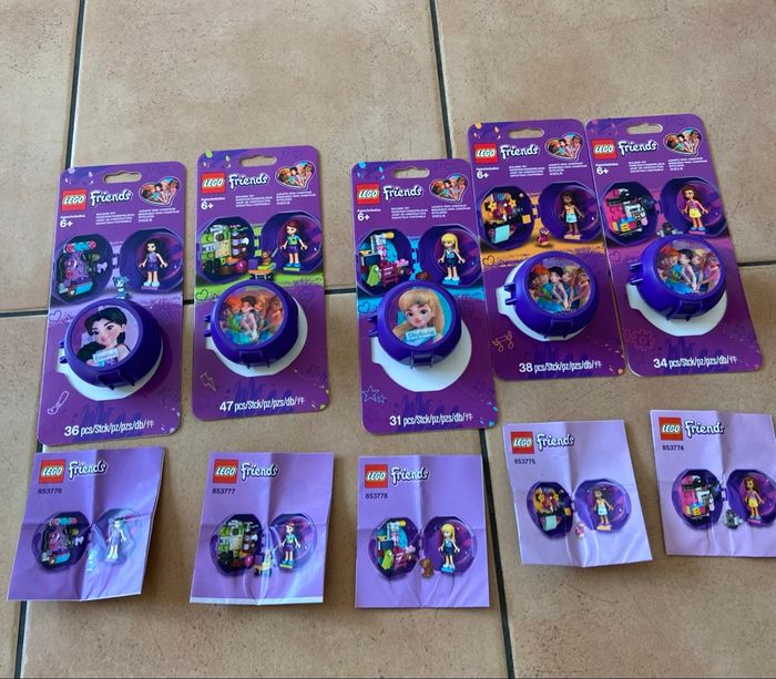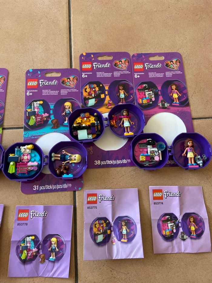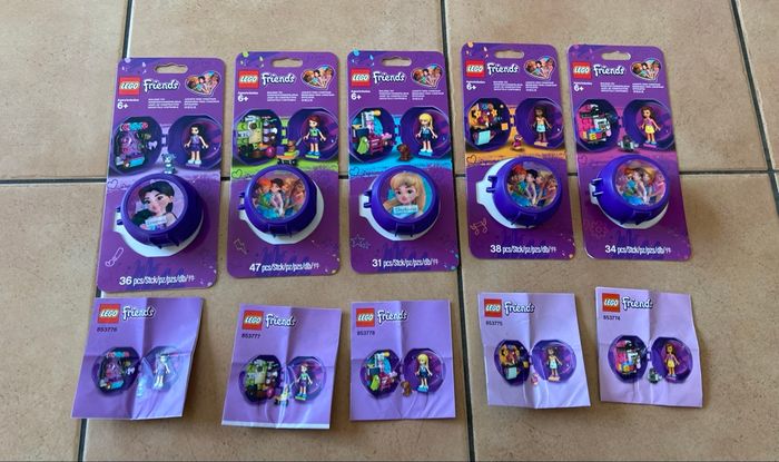 Lot de 5 capsules de Lego Friends : - 853774 : Satellite d’Olivia - 853775 : DJ d’Andréa - 853776 : Studio photo d’Emma - 853777 : exploration de Mia - 853778 : piscine de Stephanie Elles sont toutes complètes avec notices Elles ont juste été monté