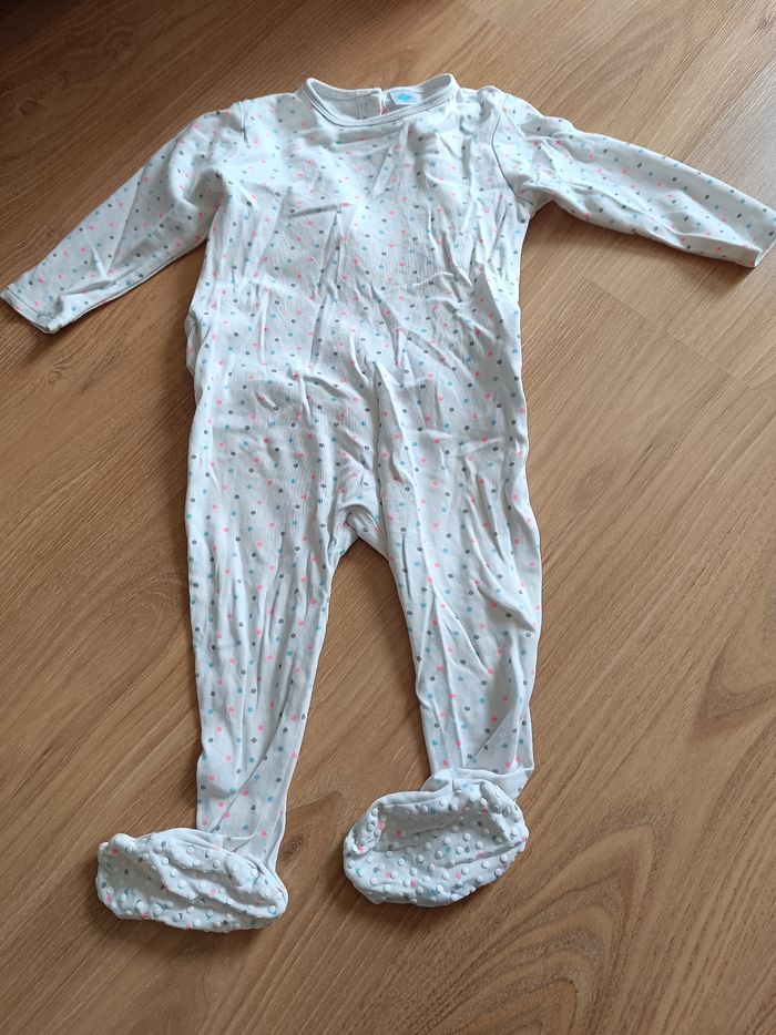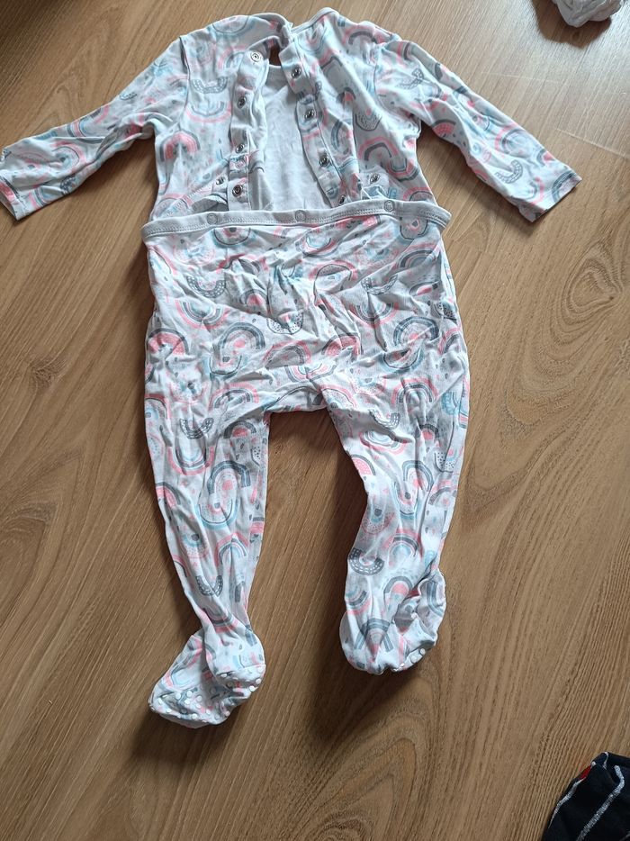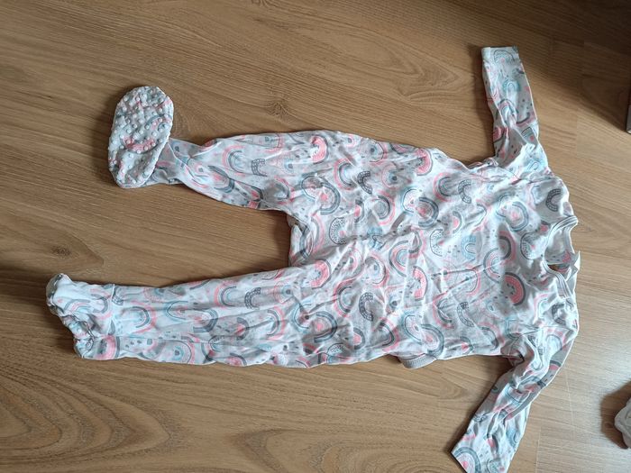 Lot de 6 pyjamas 1 pièce, ouverture à l'arrière, pieds anti dérapant motif lapin, arc en ciel petit points multicolores Marque tex taille 18 mois En tissus léger Peu porté Très bon état sauf un avec un petit accros voir dernière photo