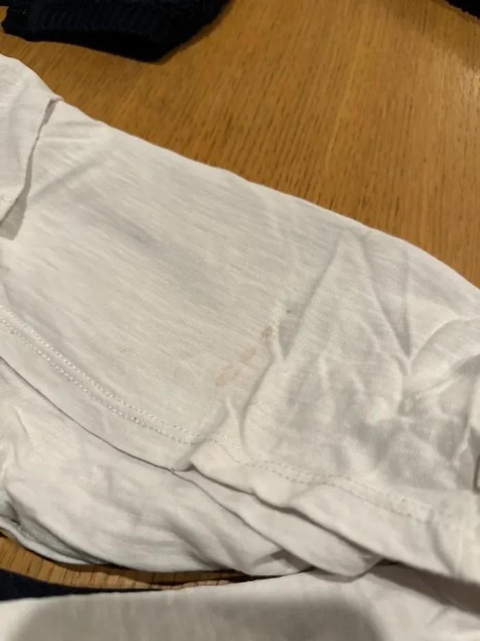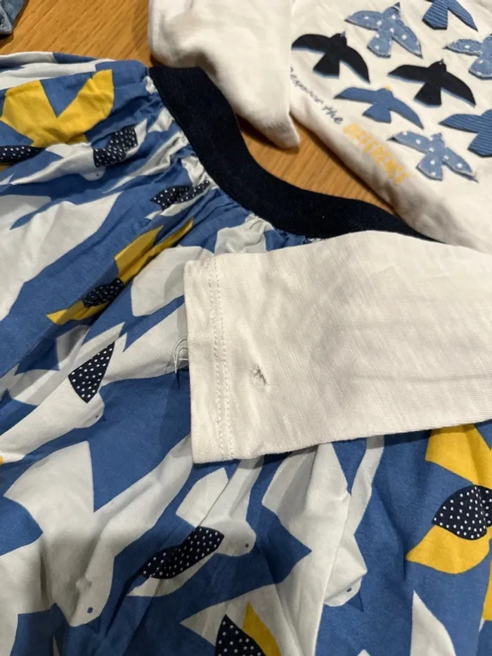 1 ensemble OKAIDI colombes jaune, blanc et bleu (tâche + petit trou sur le tee shirt) 1 combi Jean’s strass CKS 1 pull tout doux chaud Hema bleu Marine